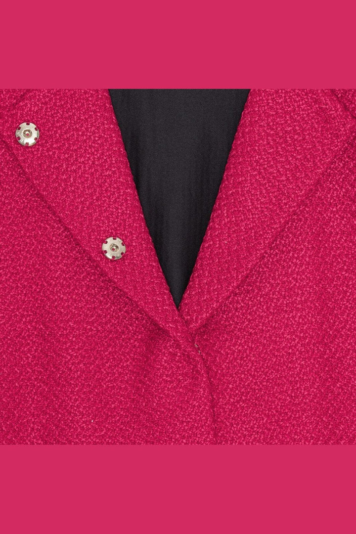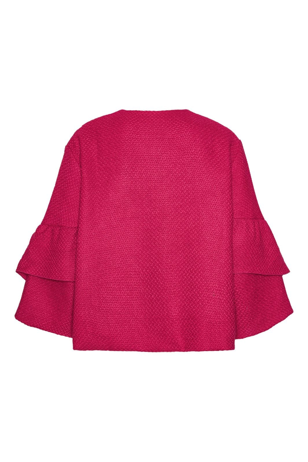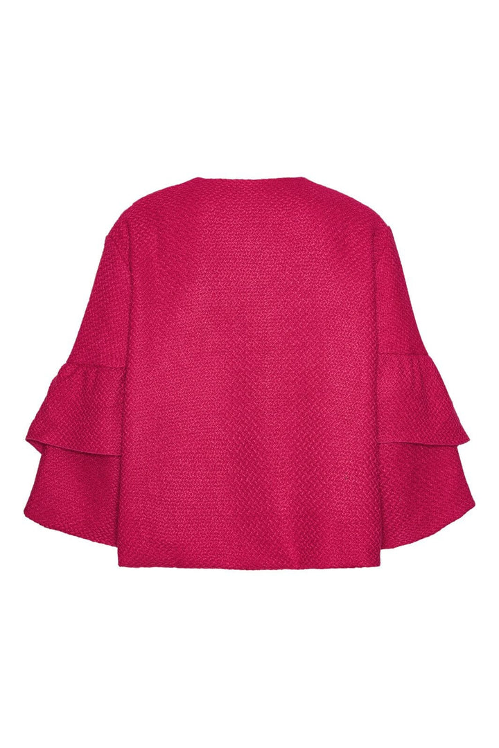 Roze jas van Karmamia in een geweven stof met zwart voering. De jas heeft brede mouwen met ruches en twee metalen knopen aan de voorkant. Het is onderdeel van een beperkte collectie.
