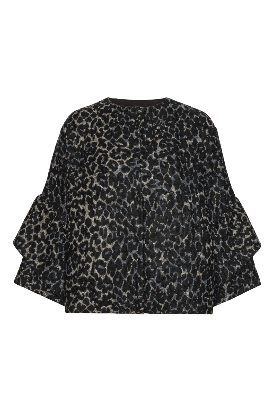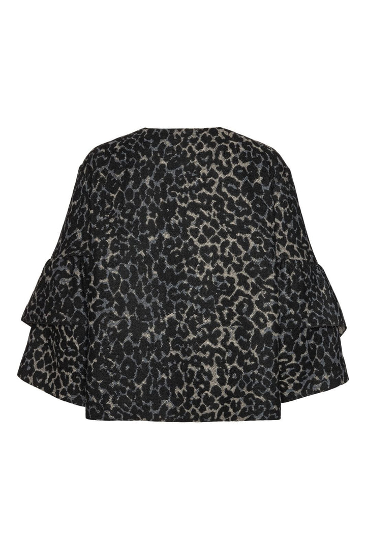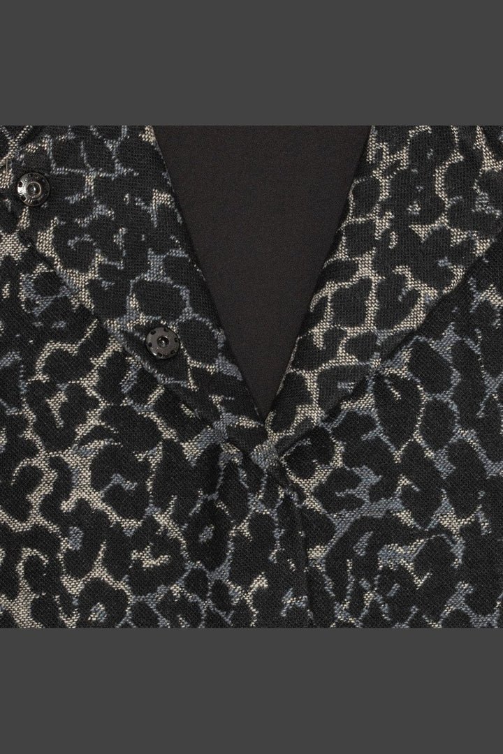 Jas fra Karmamia met luipaardprint in zwart en grijs. Het heeft een V-hals, knoopsluiting en 3/4 mouwen. De jas heeft een losse pasvorm met een patroon dat zowel op de voorkant als op de achterkant terugkomt.