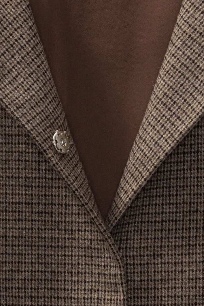 Geruite jas van Karmamia in een bruine tint. De jas heeft peplum mouwen met gelaagde ruches en twee zichtbare metalen knopen bij de halsuitsnijding.
