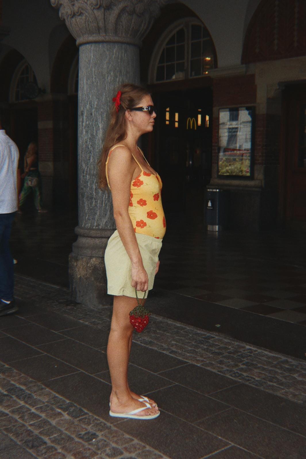 Badpak van Konges Sløjd in de kleur Viella Sol. Het badpak heeft dunne spaghettibandjes en een vierkante halslijn met een bloemenprint in rode, gele en oranje tinten.