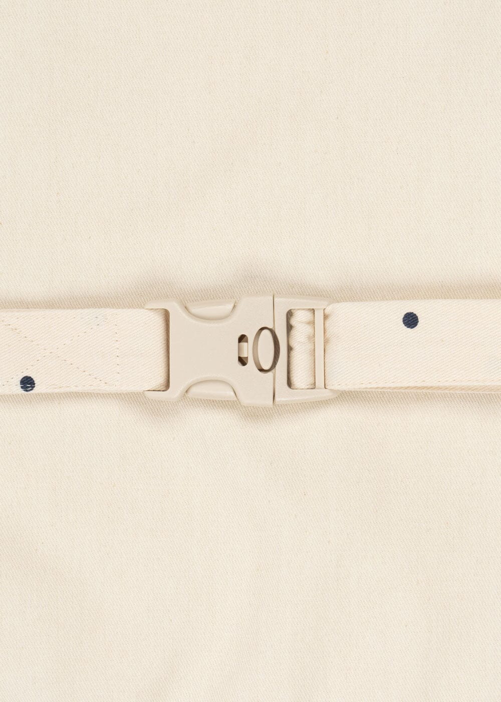Auto-organizer van Konges Sløjd in Navy Dot-patroon met donkerblauwe stippen op een crèmekleurige basis. De organizer heeft een geborduurd kersendetail aan de voorkant.