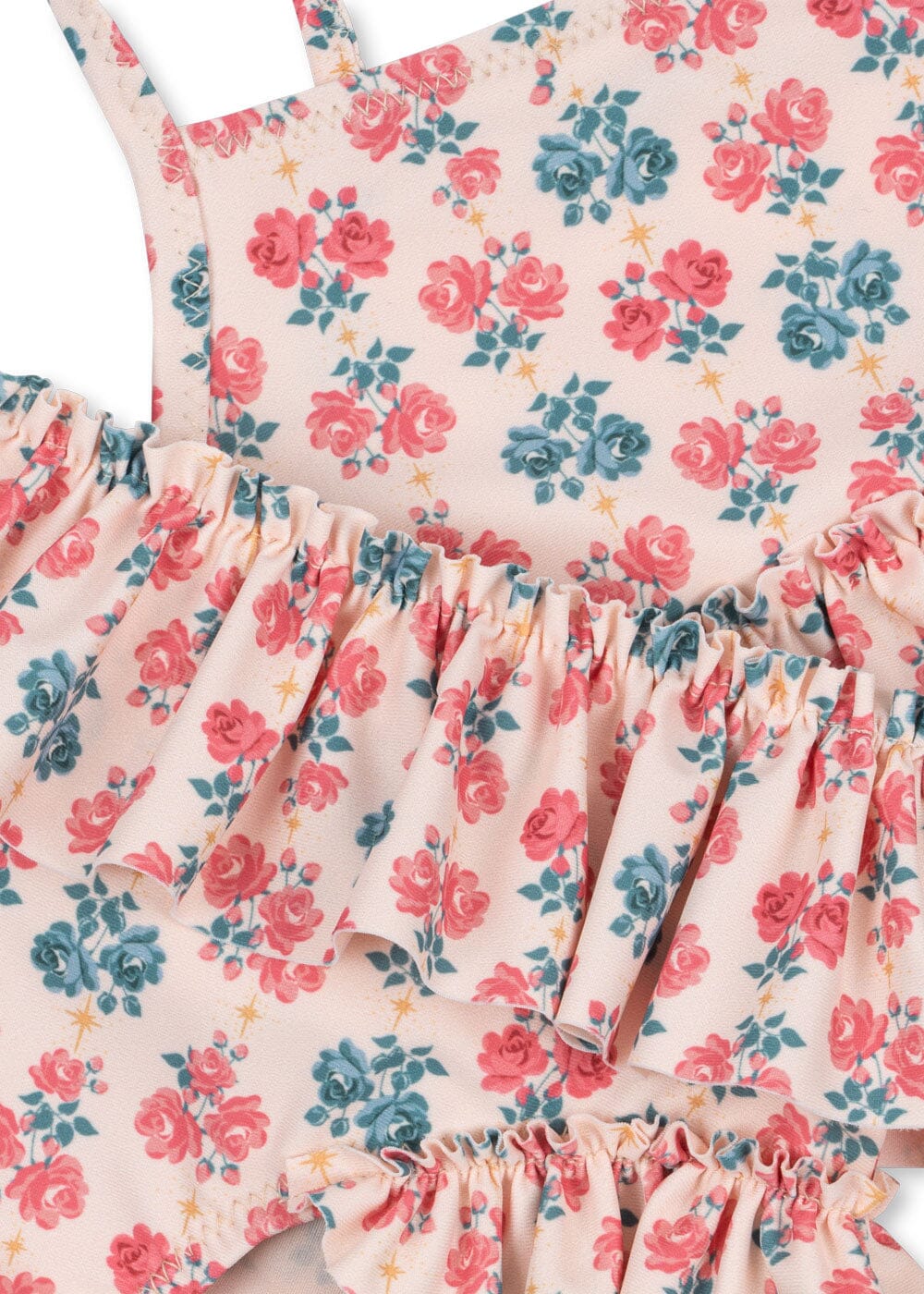 Een tweedelige bikini van Konges Sløjd met een bloemenpatroon in roze en blauw. Zowel het topje als het broekje hebben ruchesdetails.