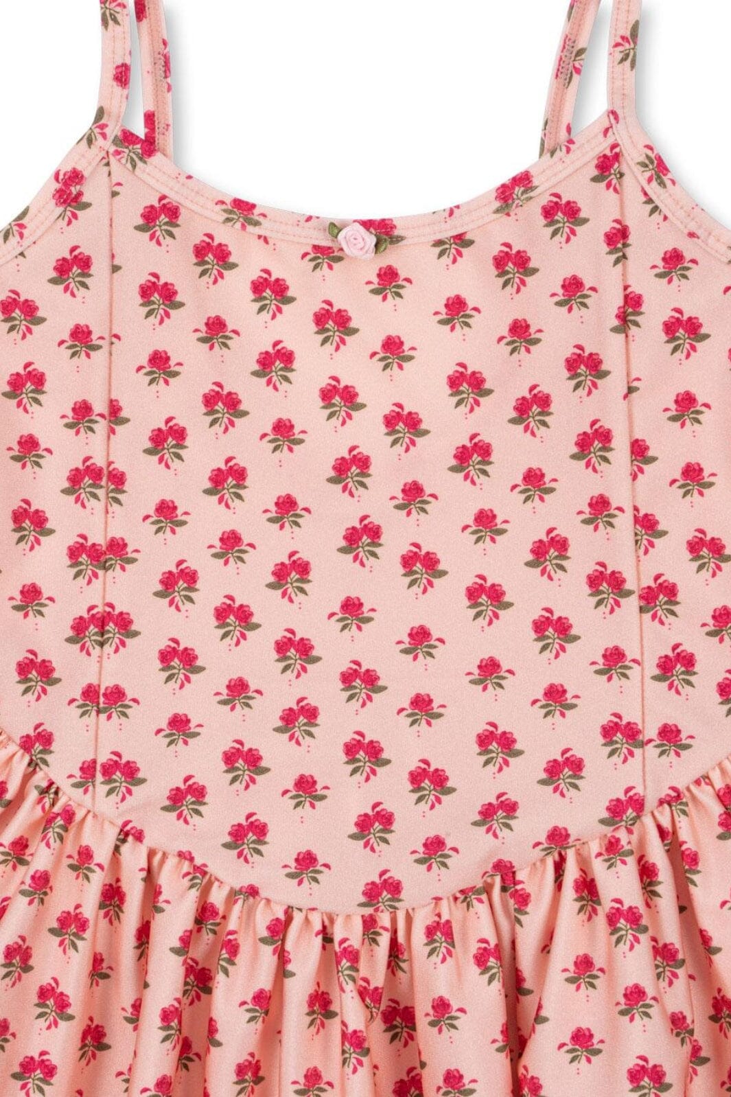 Jurk van Konges Sløjd met bloemenprint in roze tinten. De dunne bandjes zijn verstelbaar en de jurk heeft ruches en een ronde halsuitsnijding.