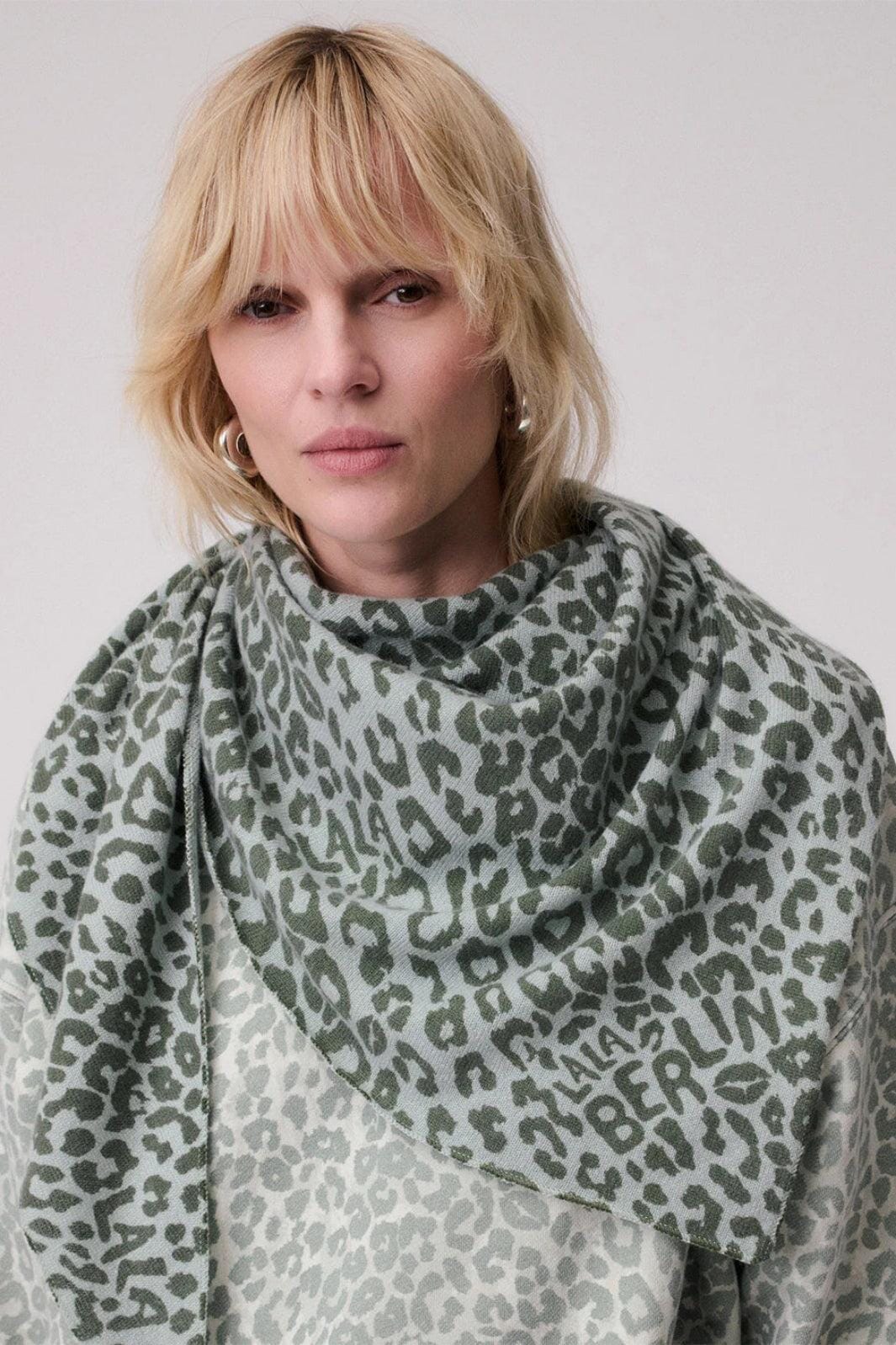 Driehoekige sjaal van Lala Berlin, gemaakt van bedrukt kasjmier met een luipaardpatroon in groene tinten. De sjaal heeft een driehoekige vorm met Lala Berlin-branding.