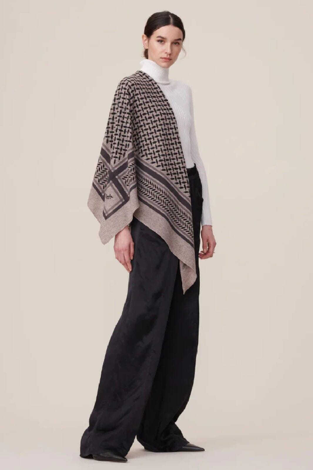 Drihoekige sjaal van Lala Berlin in bruin melange. Een grote sjaal met het kenmerkende Kufiya-patroon op een bruine achtergrond. De sjaal is gemaakt van kasjmier.