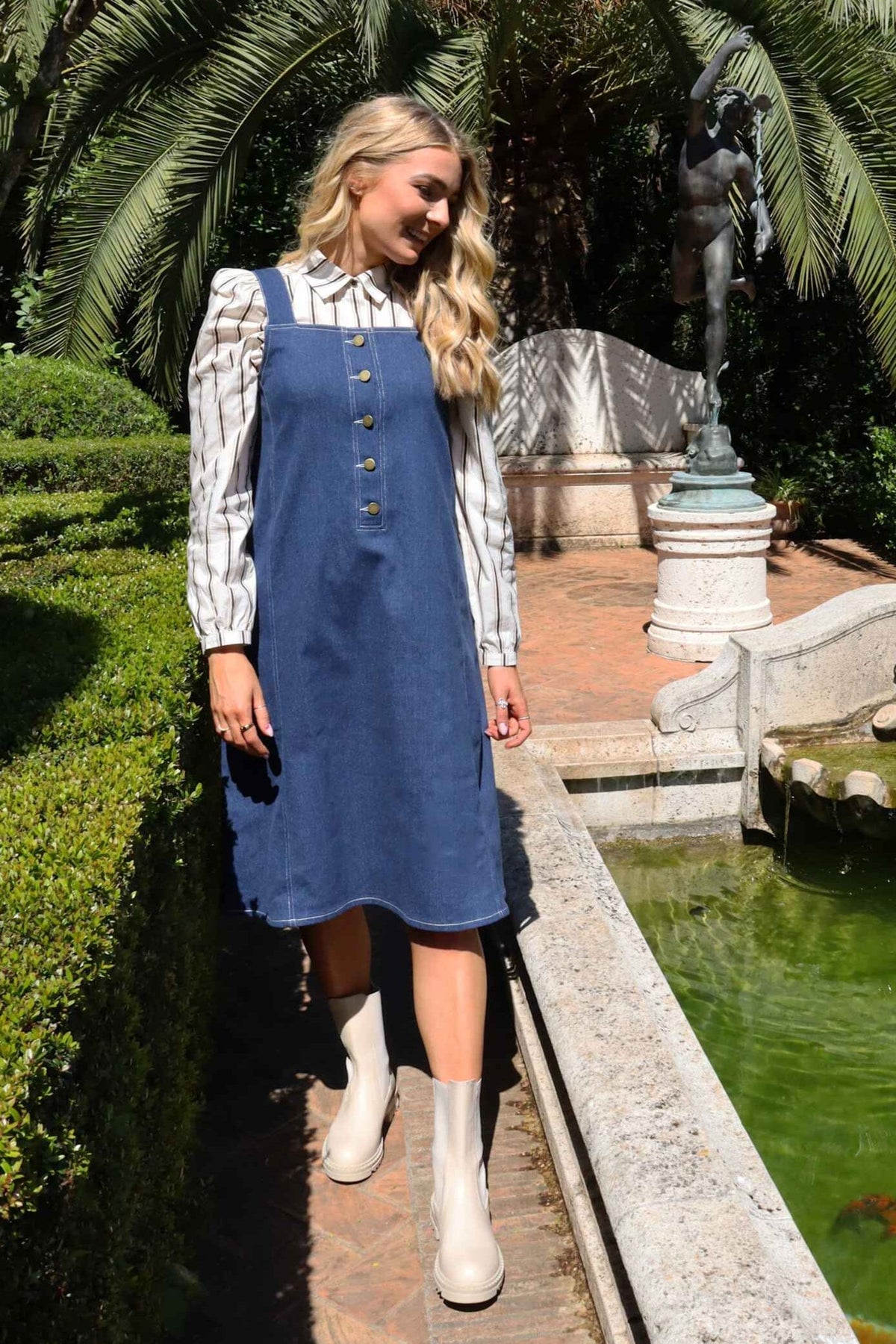 Denim-overall van Liberte in klassiek blauw. Het heeft brede schouderbanden en een knoopsluiting aan de voorkant met decoratieve stiksels langs de randen.