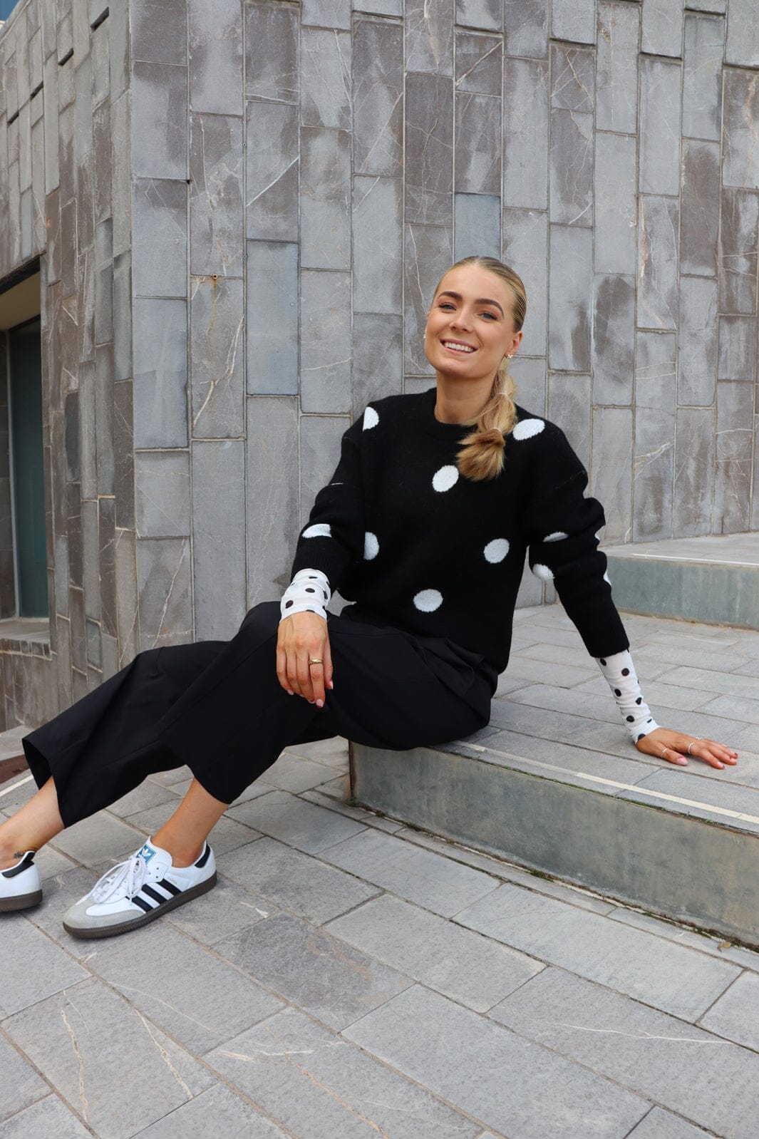 Zwarte trui van Liberte met witte stippen. De trui heeft een ronde halslijn, lange mouwen en een losse pasvorm.