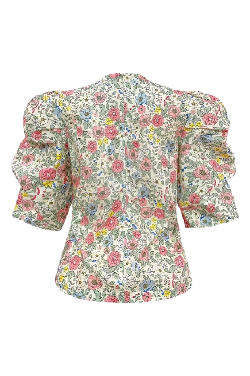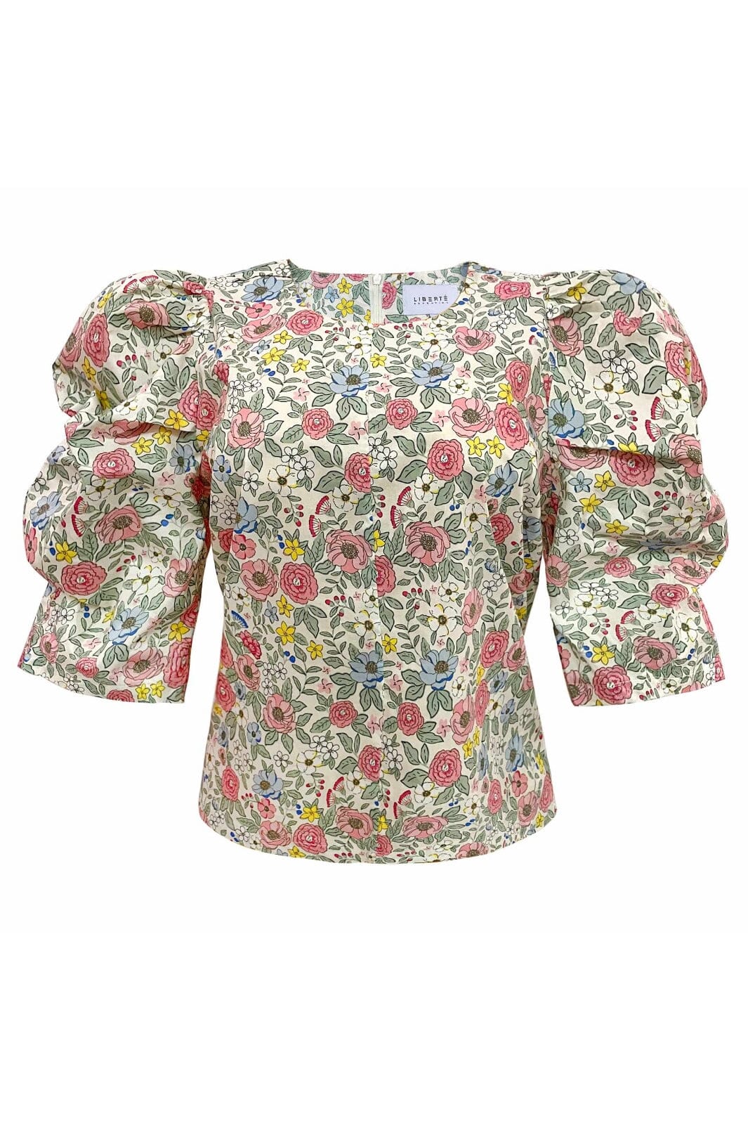 Blouse van Liberte met bloemenprint in wit met roze en blauwe bloemen. Het heeft een ronde halslijn en 3/4-mouwen met puff.