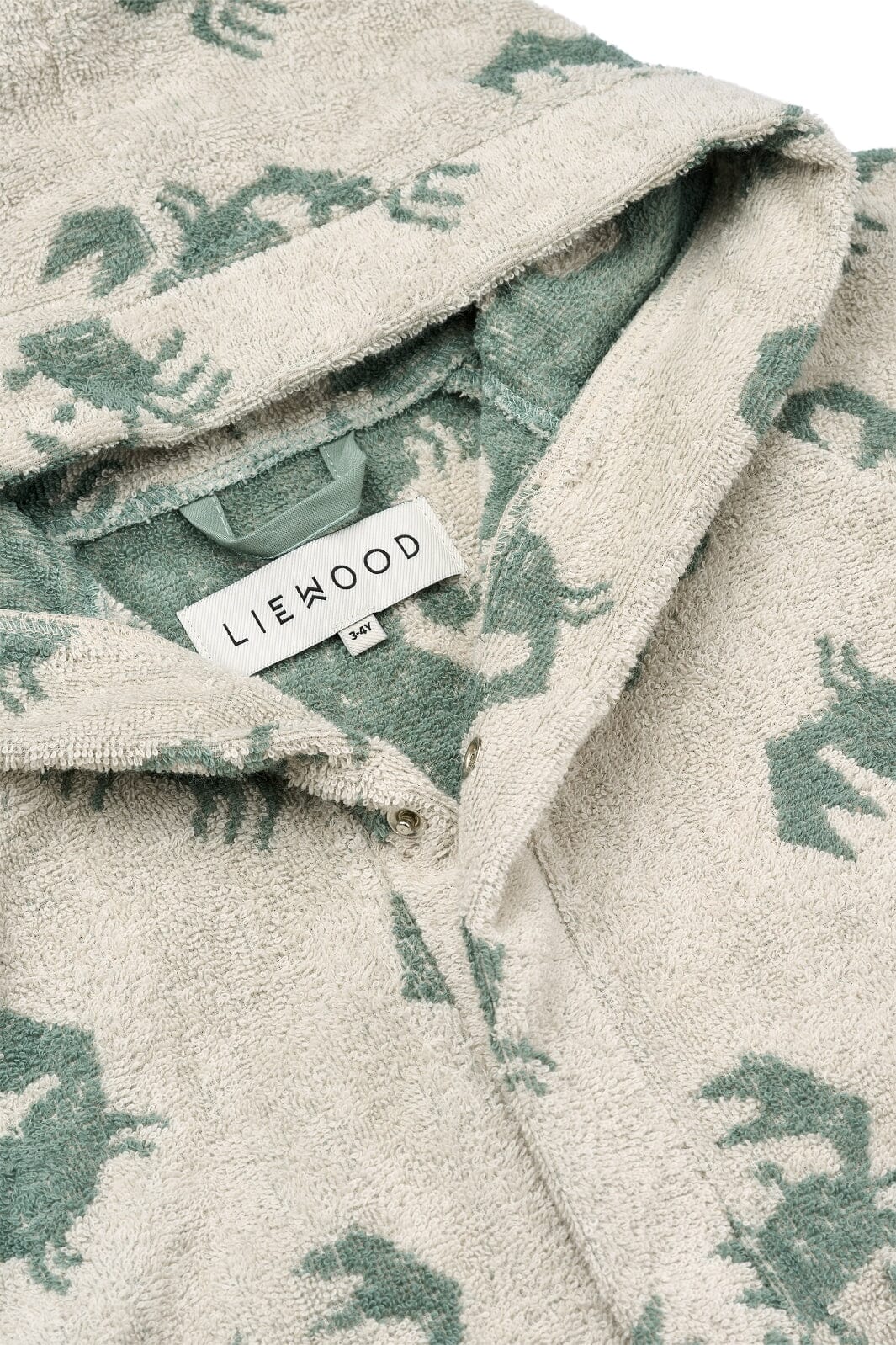 Badjas van Liewood in zandkleurige katoen met groene krabbenpatronen. De badjas heeft een praktische capuchon en een knielange model met een strikband in de taille.