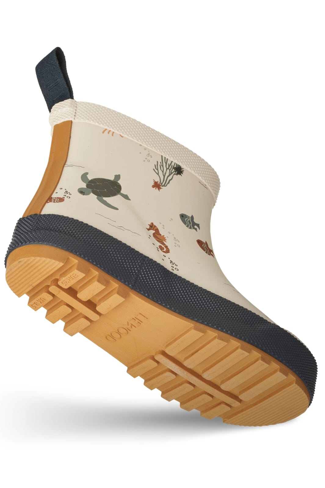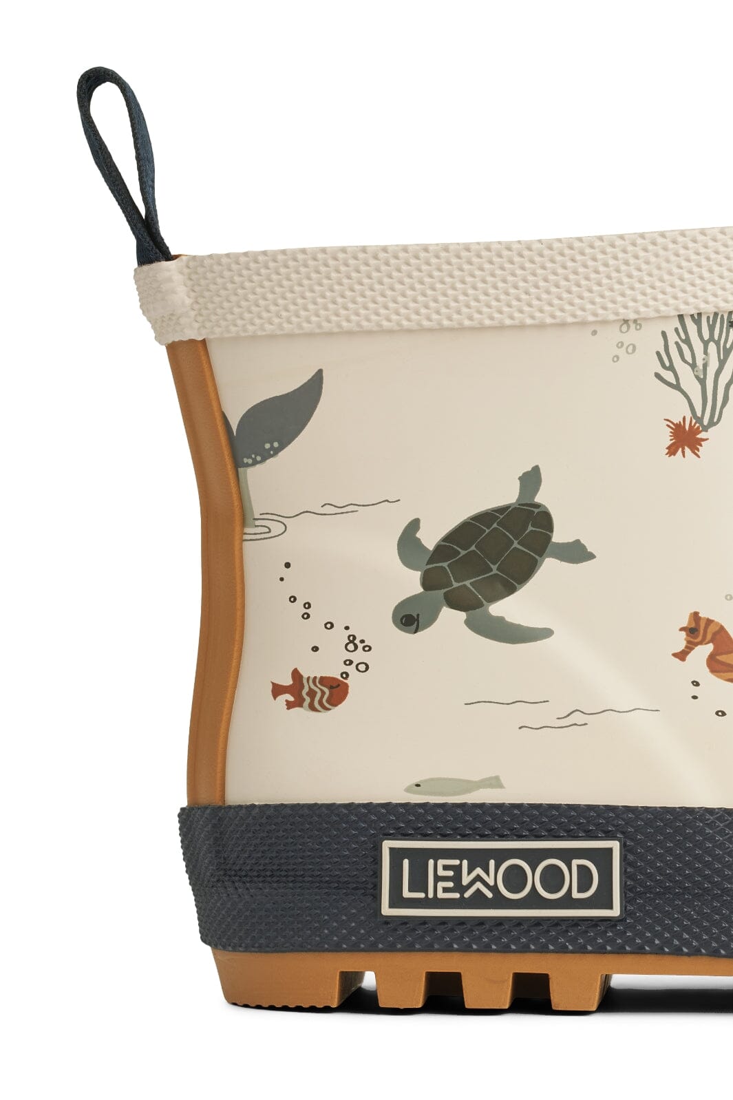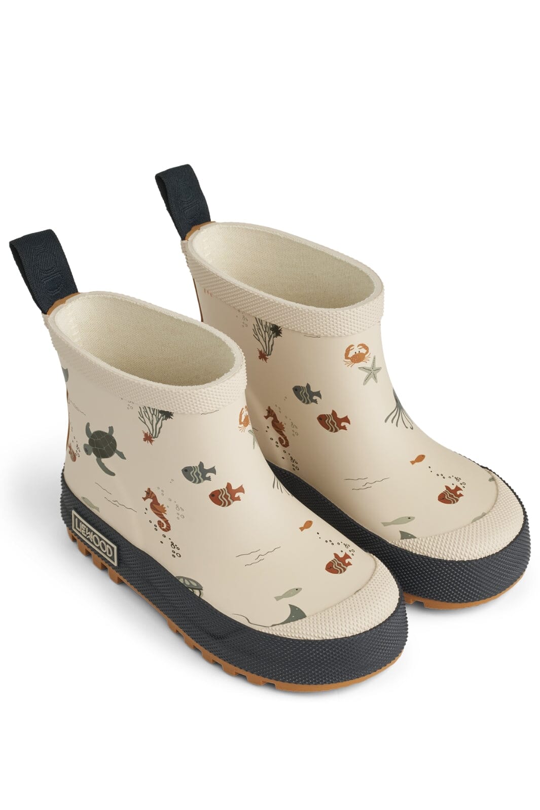 Zandkleurige rubberlaarzen van Liewood met schattige zeedieren zoals schildpadden, vissen en krabben. De laarzen hebben een praktische lus aan de achterkant en een donkerblauwe zool.