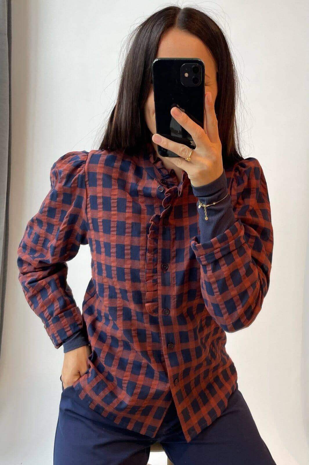 Geruite blouse van Love & Divine in donkerblauwe en bordeauxrode tinten. De blouse heeft pofmouwen en een hoge hals met ruchesdetails en een knoopsluiting aan de voorkant.