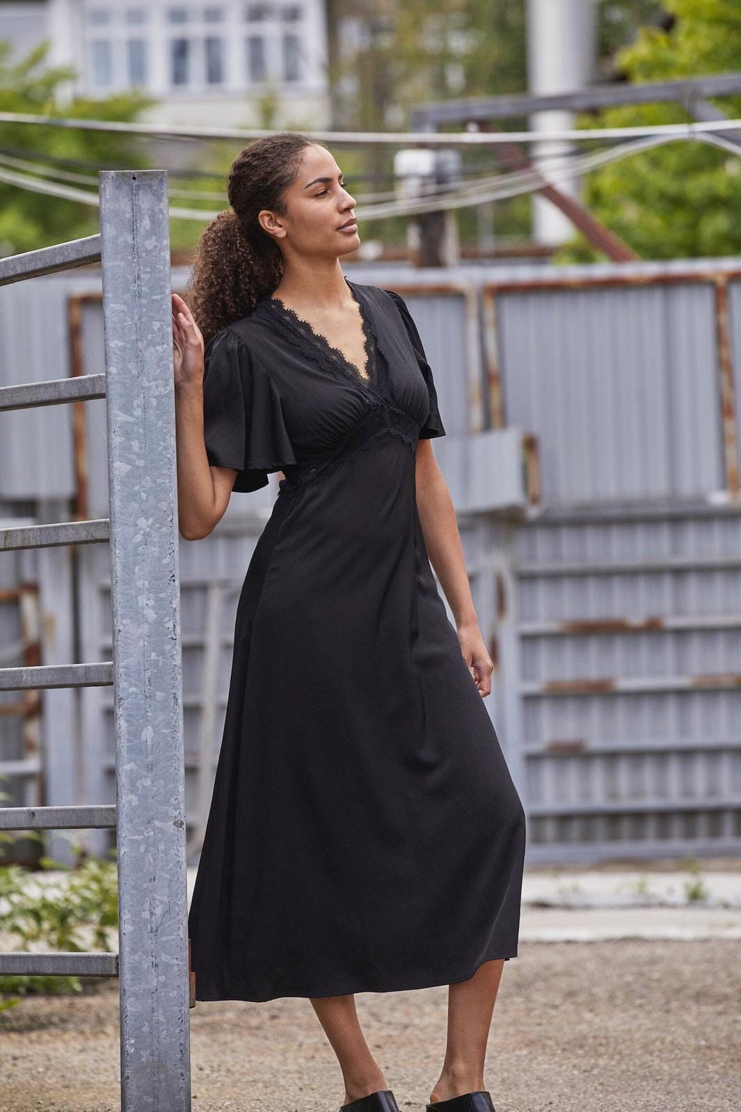 Zwarte maxijurk van Love & Divine met V-hals en kantdetails. De jurk heeft korte vleermuismouwen en is gemaakt van een glad materiaal dat soepel langs het lichaam valt.