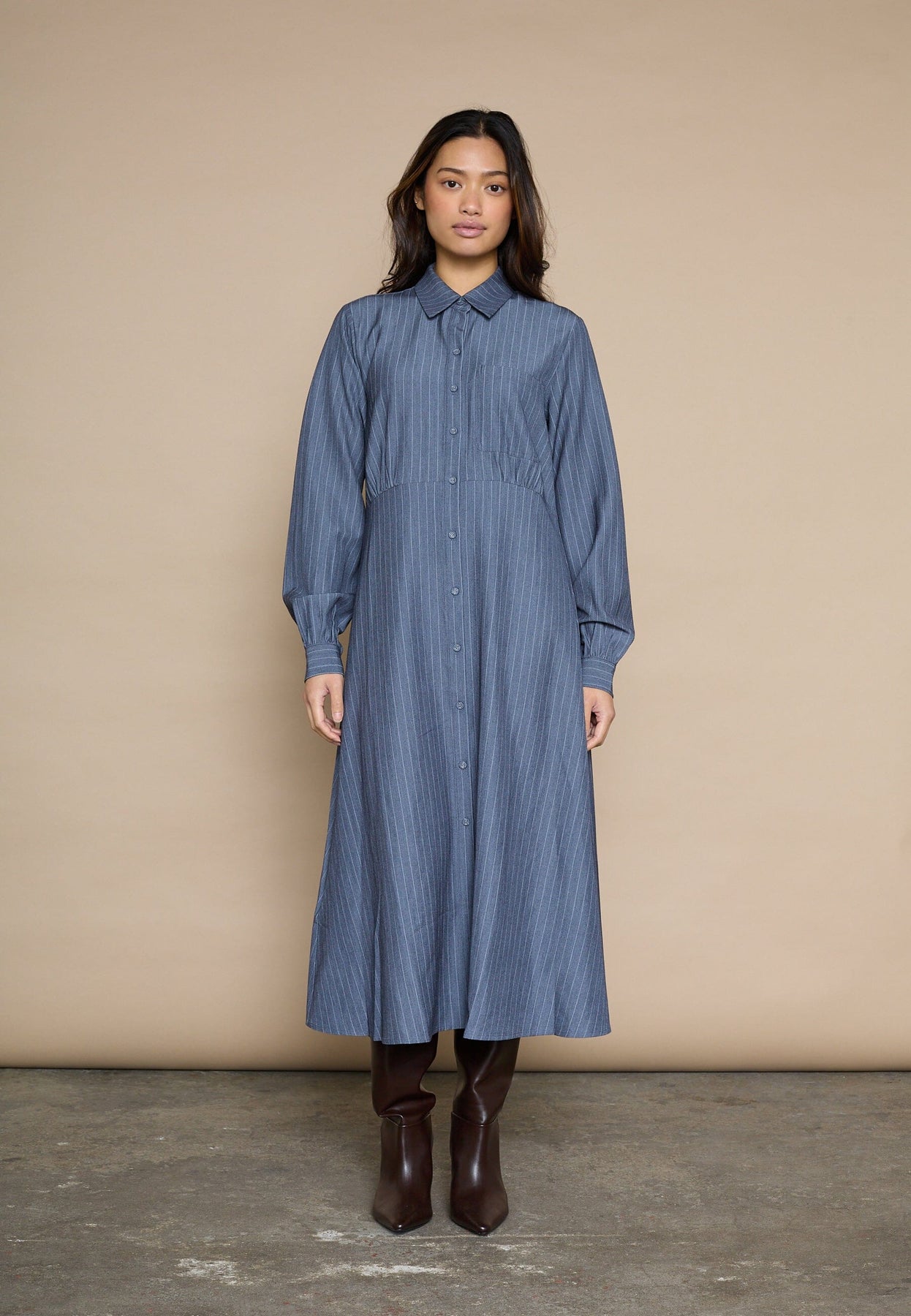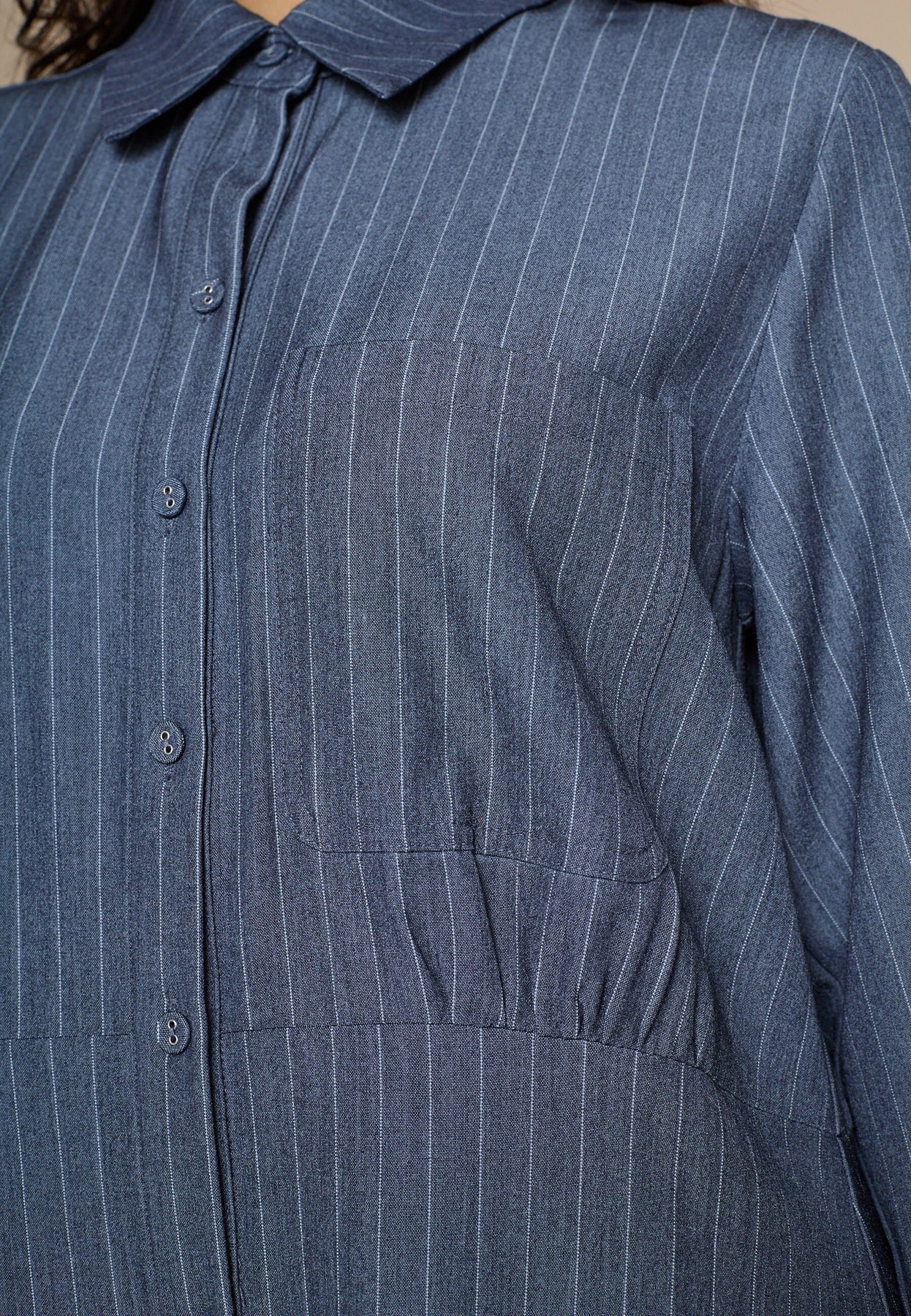 Overhemdjurk van Love & Divine met subtiele strepen in blauwtinten. De jurk heeft een klassieke overhemdkraag en een doorlopende knoopsluiting aan de voorkant.