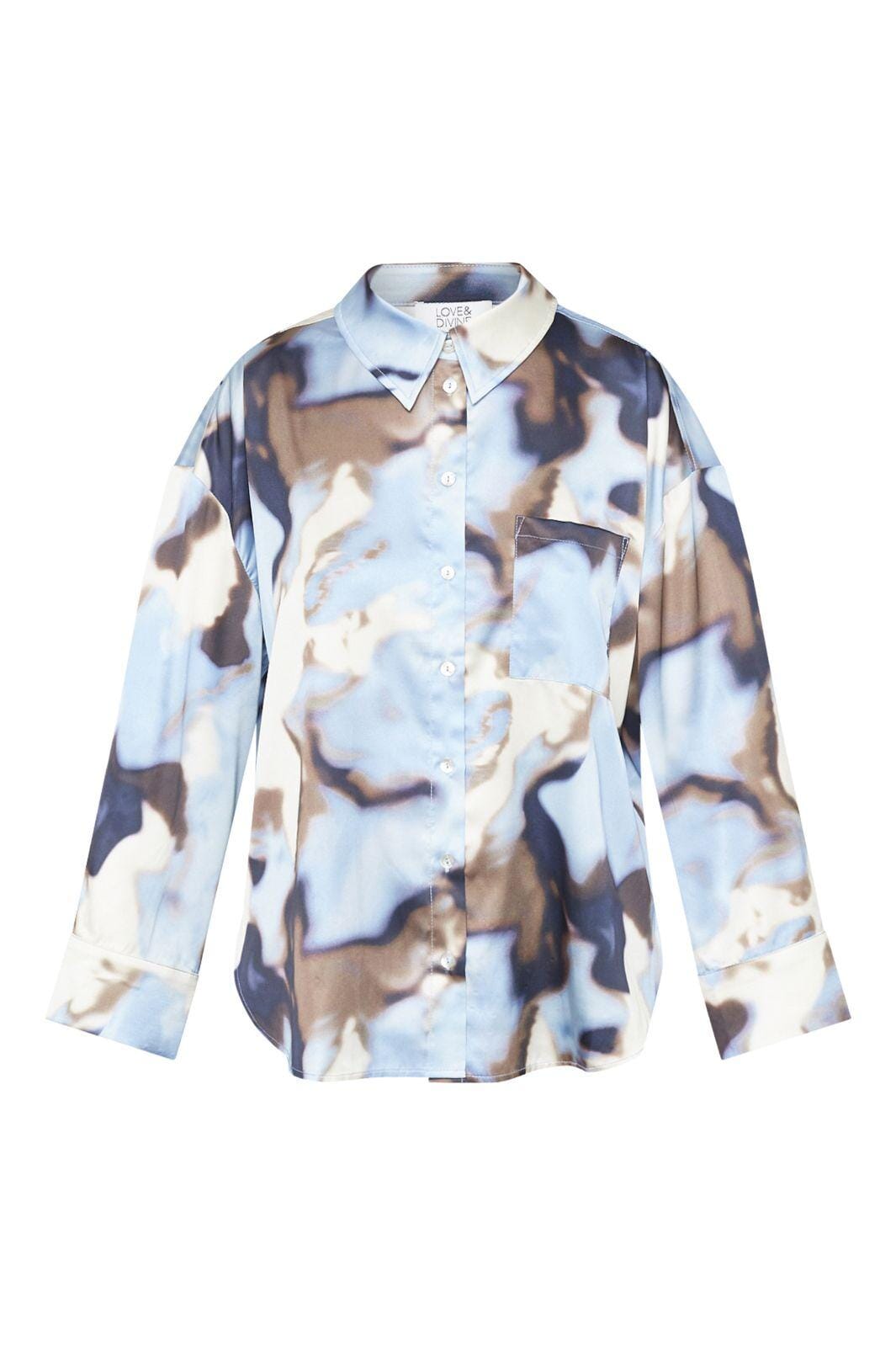 Blouse van Love & Divine met een abstract patroon in lichtblauwe en bruine tinten. Gemaakt van 100% polyester met een klassieke kraag en knoopsluiting.