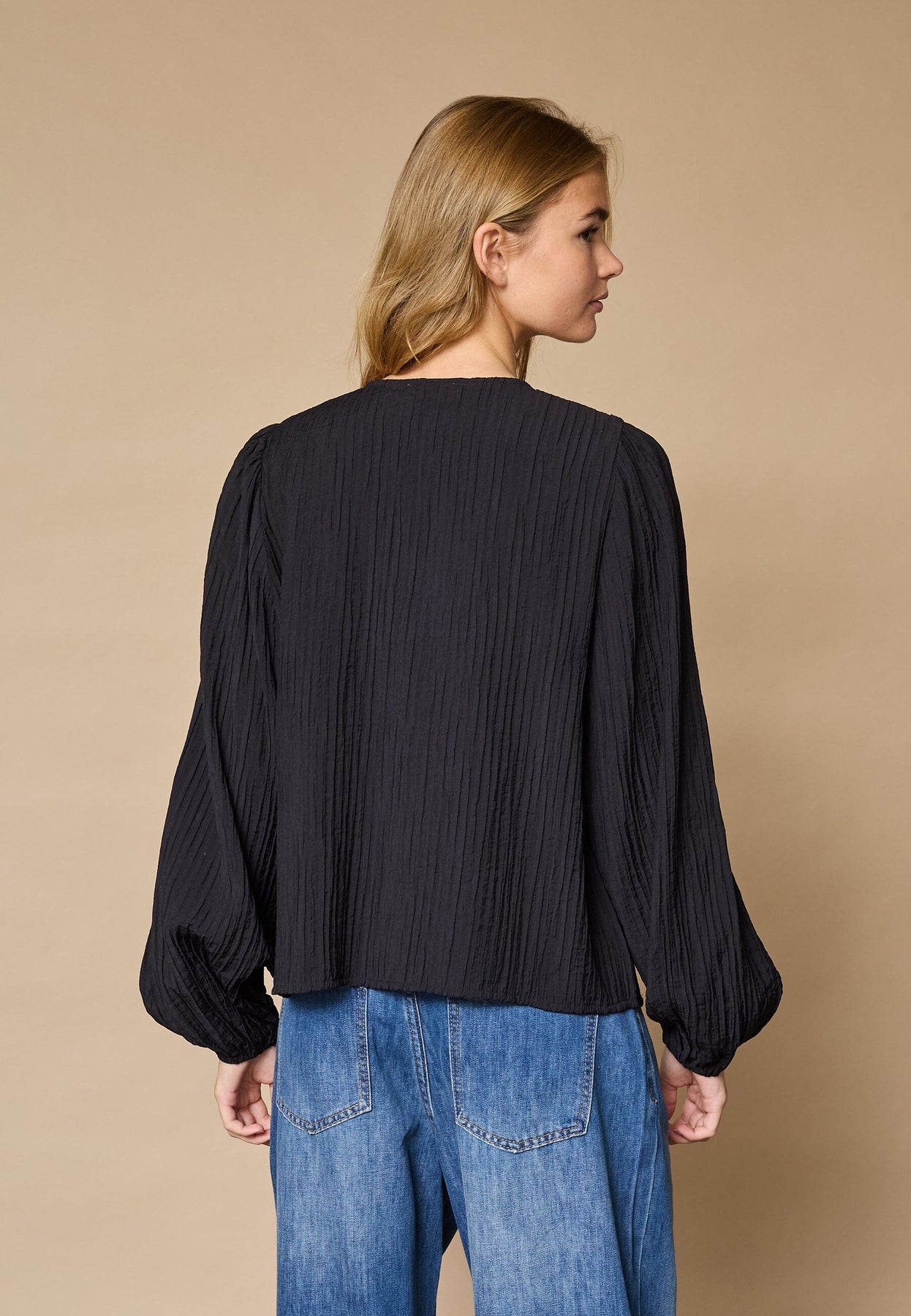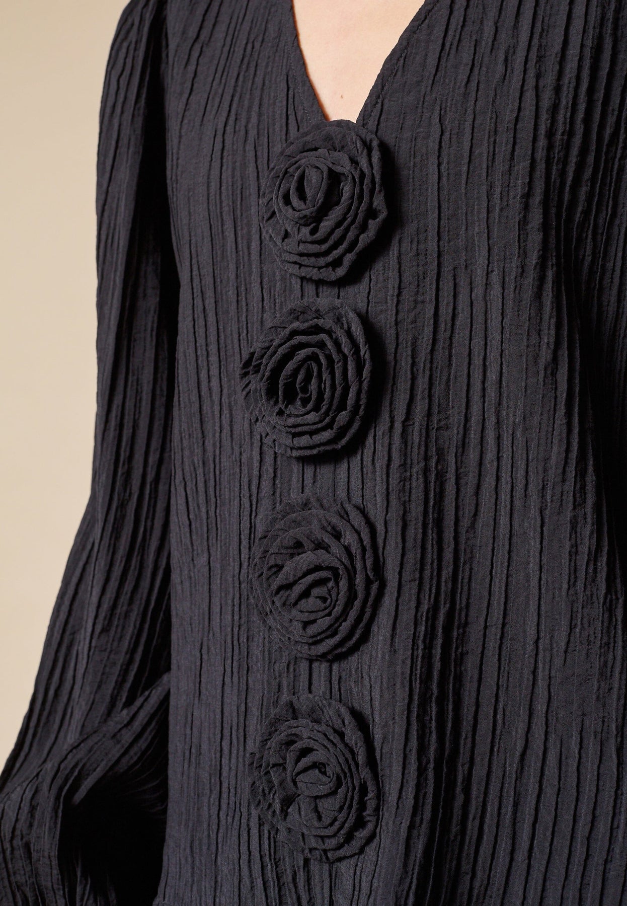 Zwarte blouse van Love & Divine met vier decoratieve, bloemachtige details aan de voorkant, lange mouwen met licht gepofte manchetten en een V-hals.