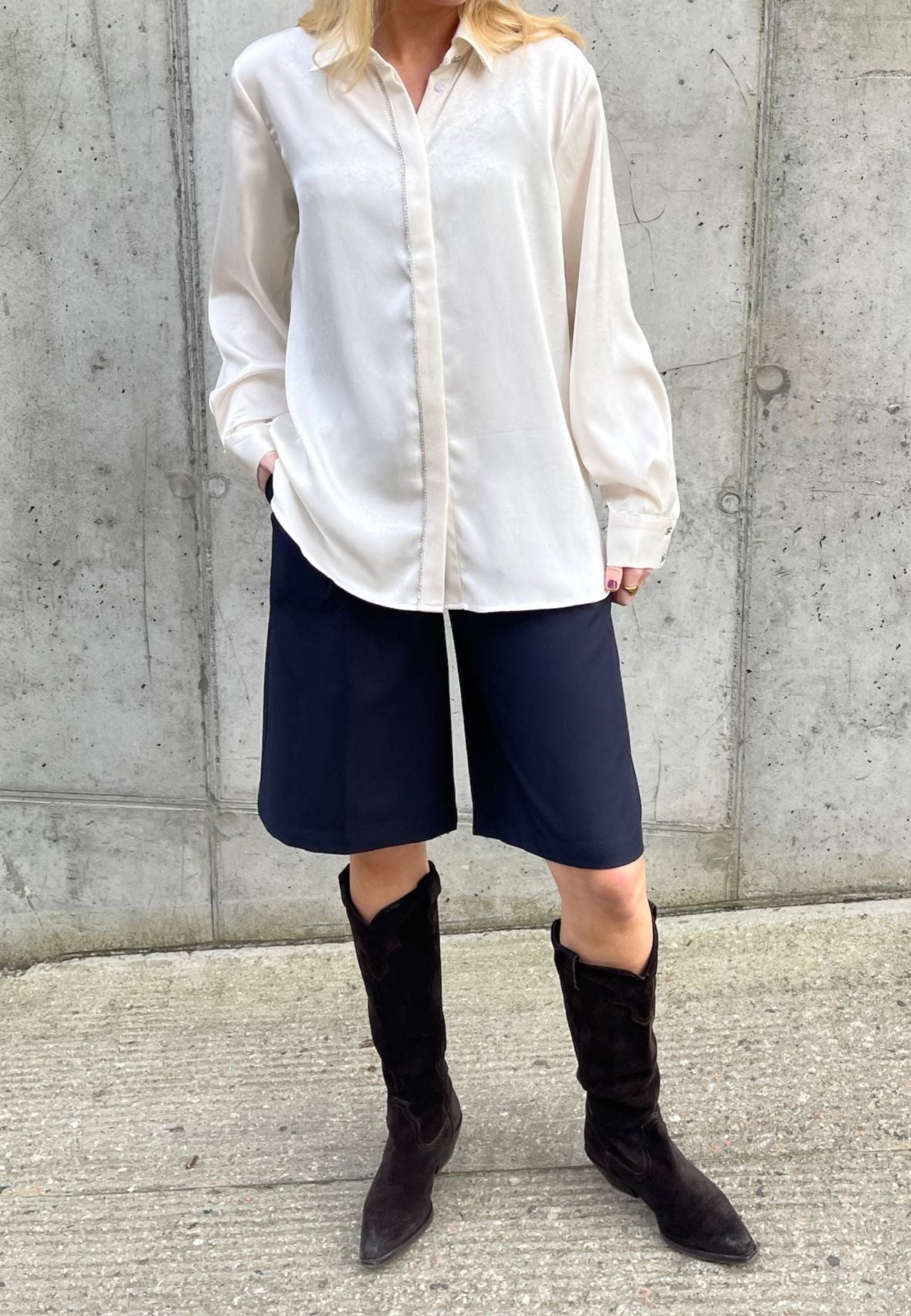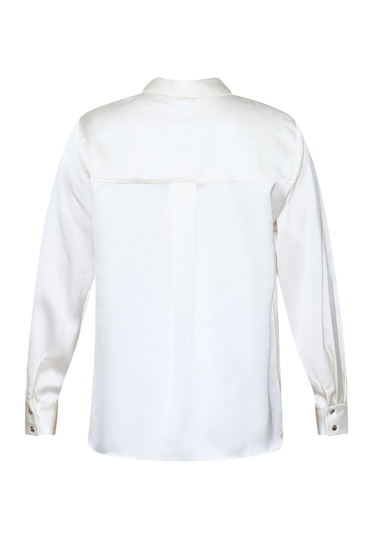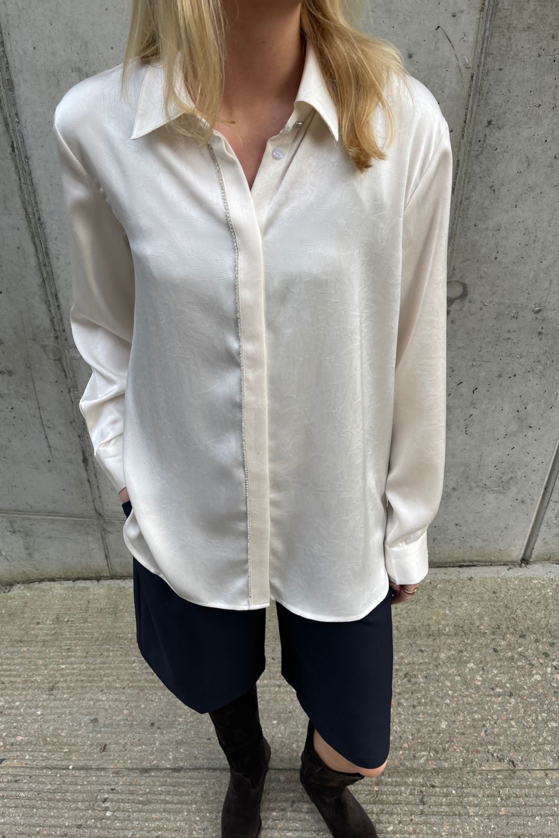 Crèmekleurige blouse van Love & Divine met een klassieke kraag en lange mouwen. De blouse heeft pailletten langs de knoopsluiting en manchetten met knopen.