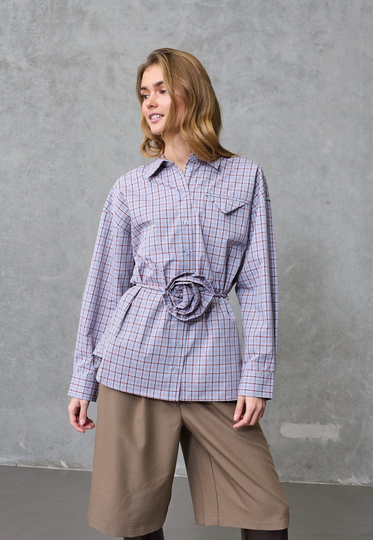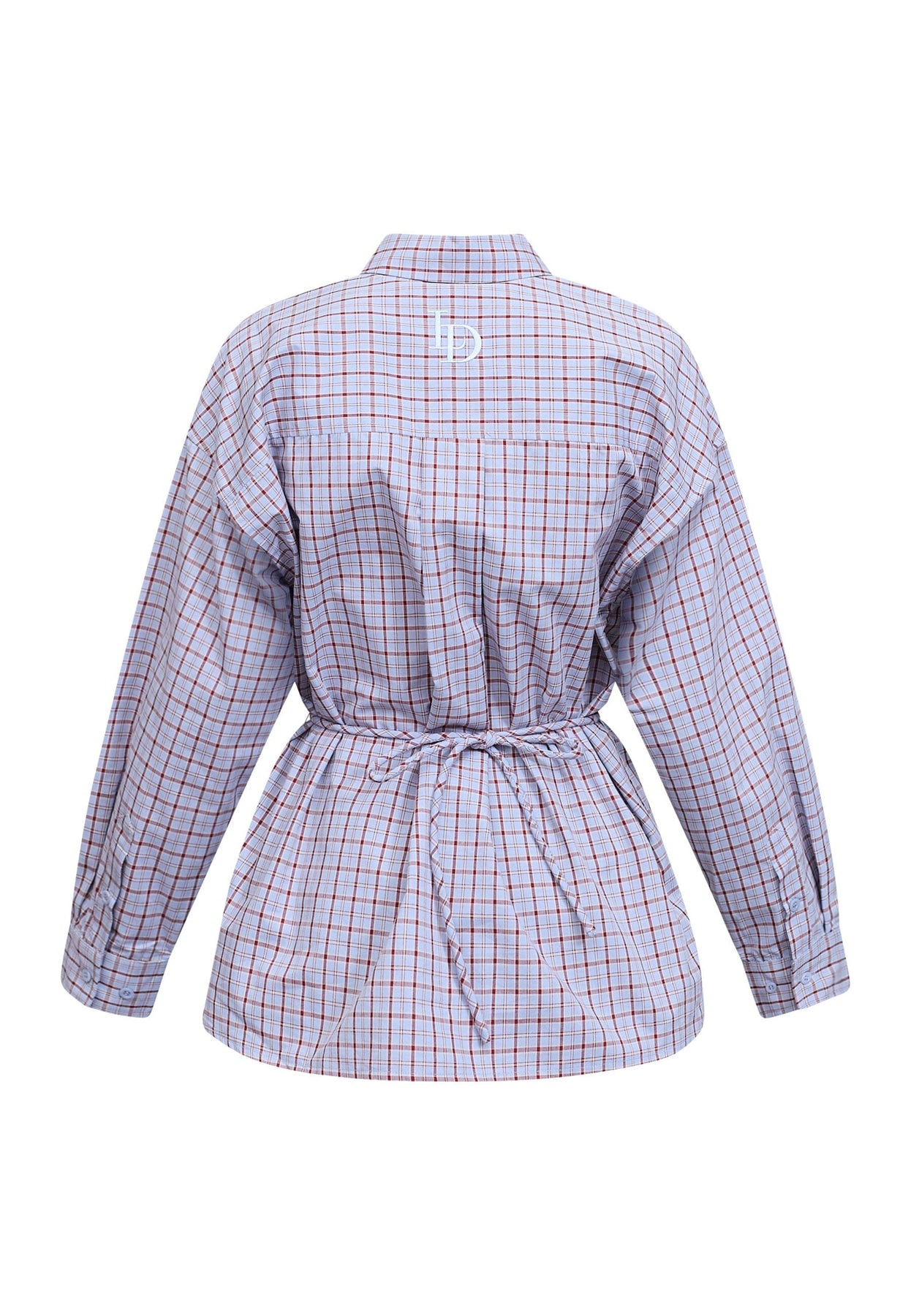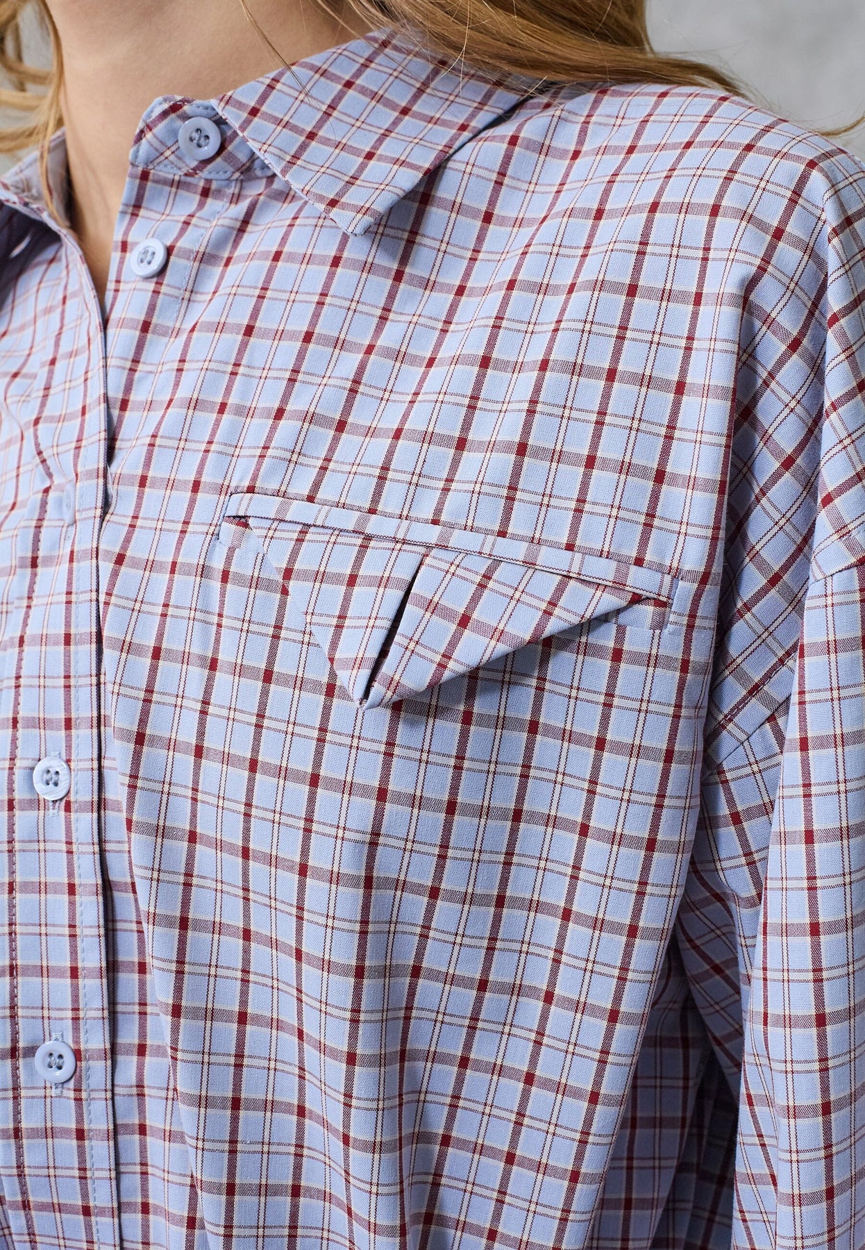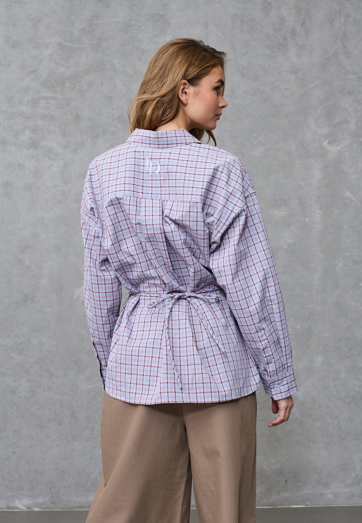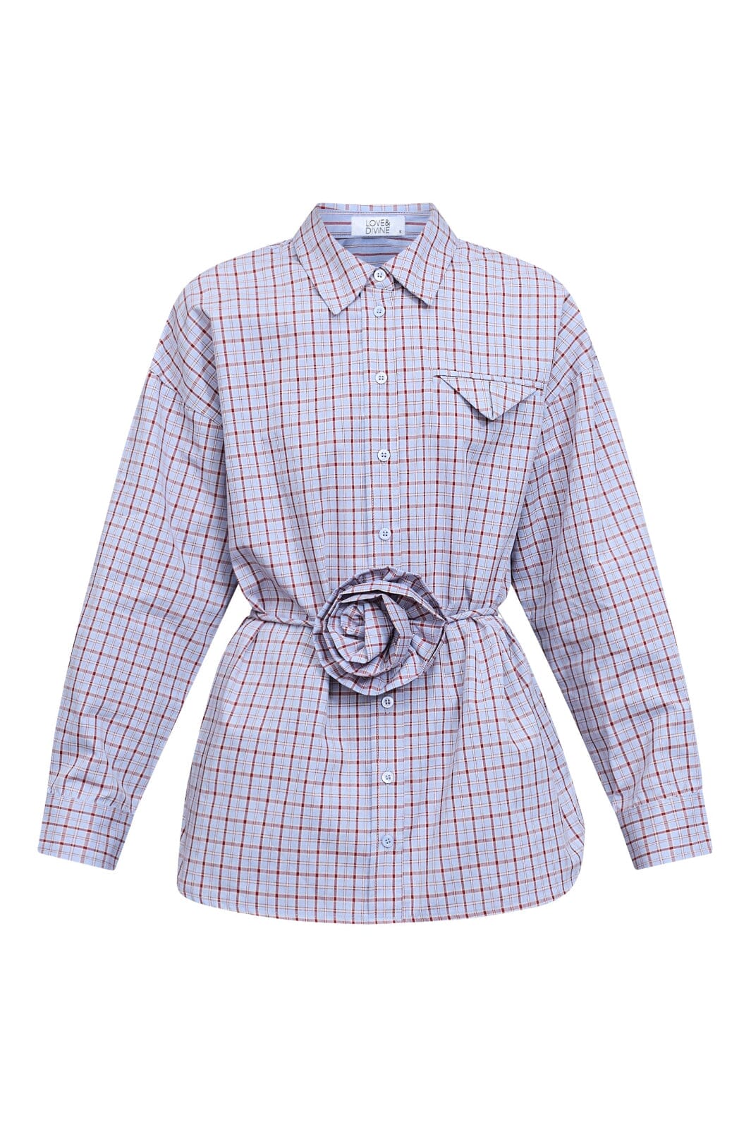 Geruit overhemd van Love & Divine in lichtblauwe, blauwe en rode tinten. Het overhemd heeft een klassieke overhemdkraag en een oversized pasvorm met lange mouwen.