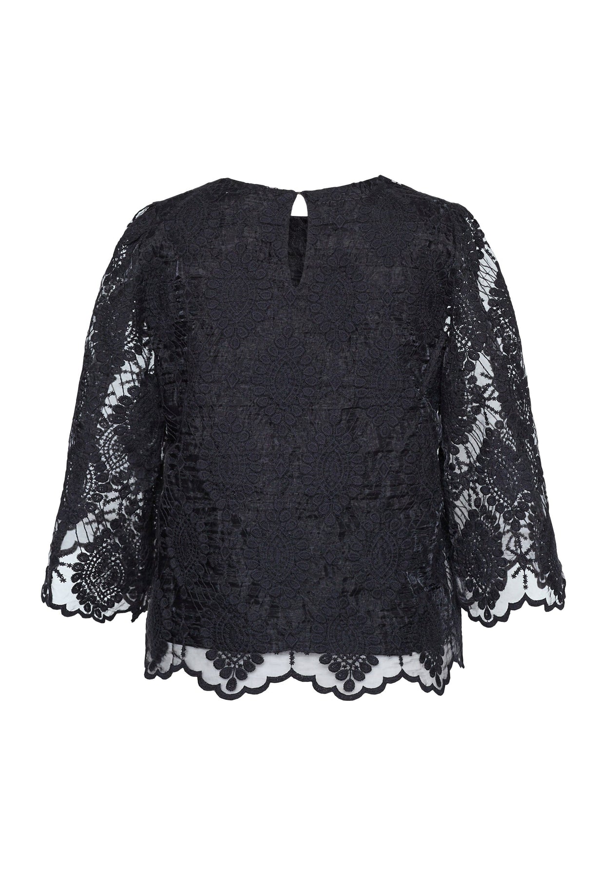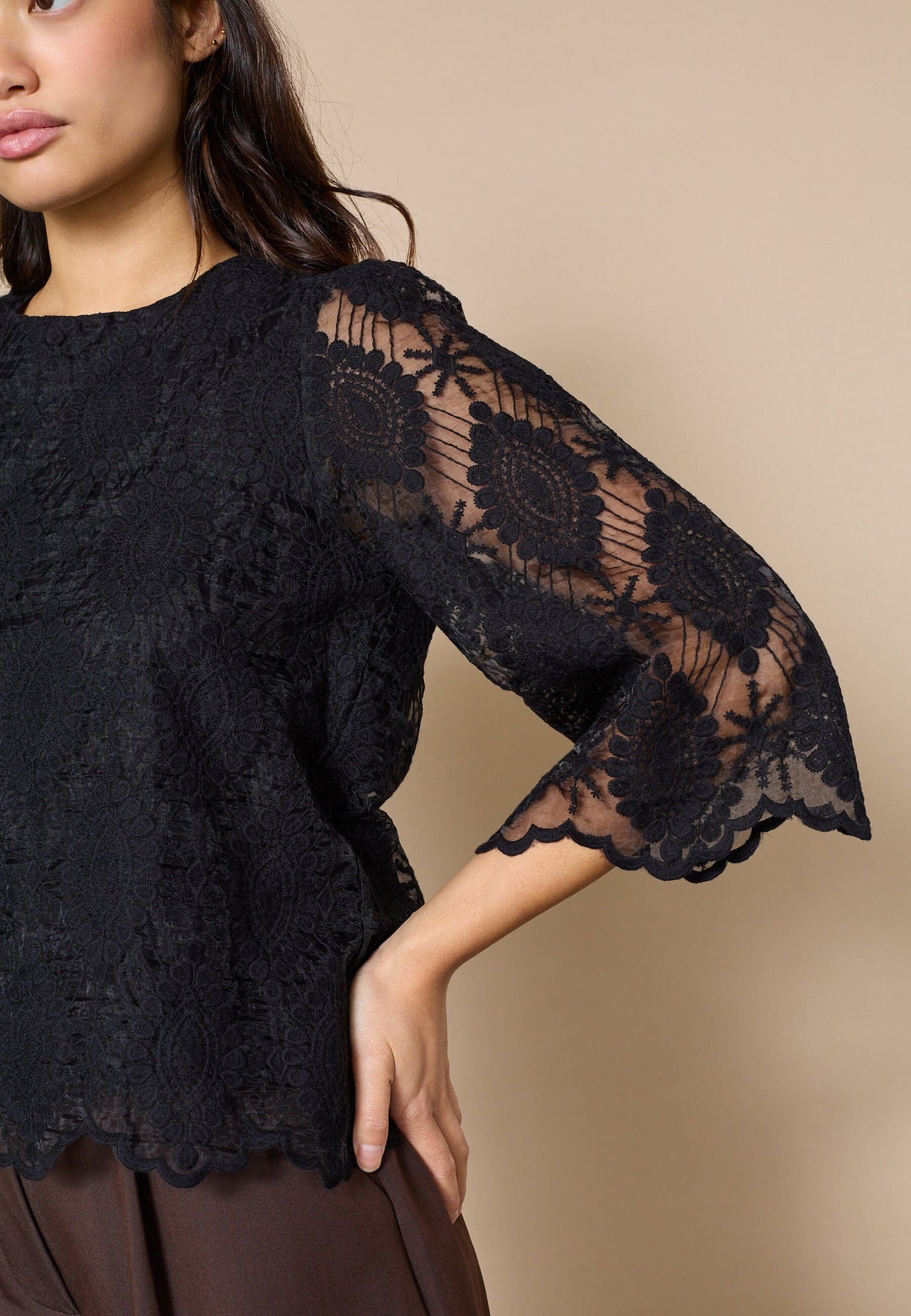 Zwarte kanten blouse van Love & Divine, gemaakt van 100% polyester met een bloemenkant-design en driekwartmouwen met kantpatroon.
