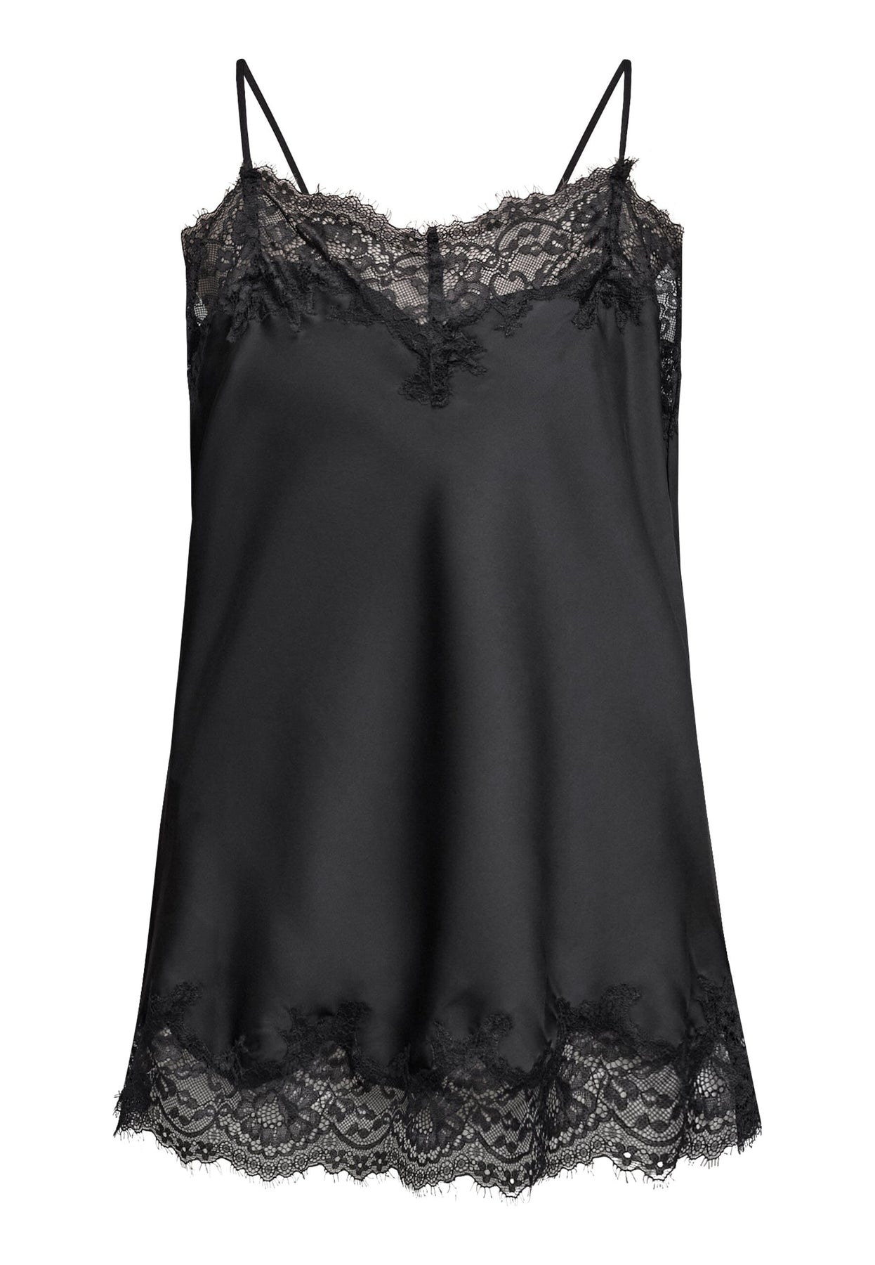 Zwart topje van Love & Divine met dunne spaghettibandjes en kanten randen. Het topje heeft een V-hals en een losse pasvorm.