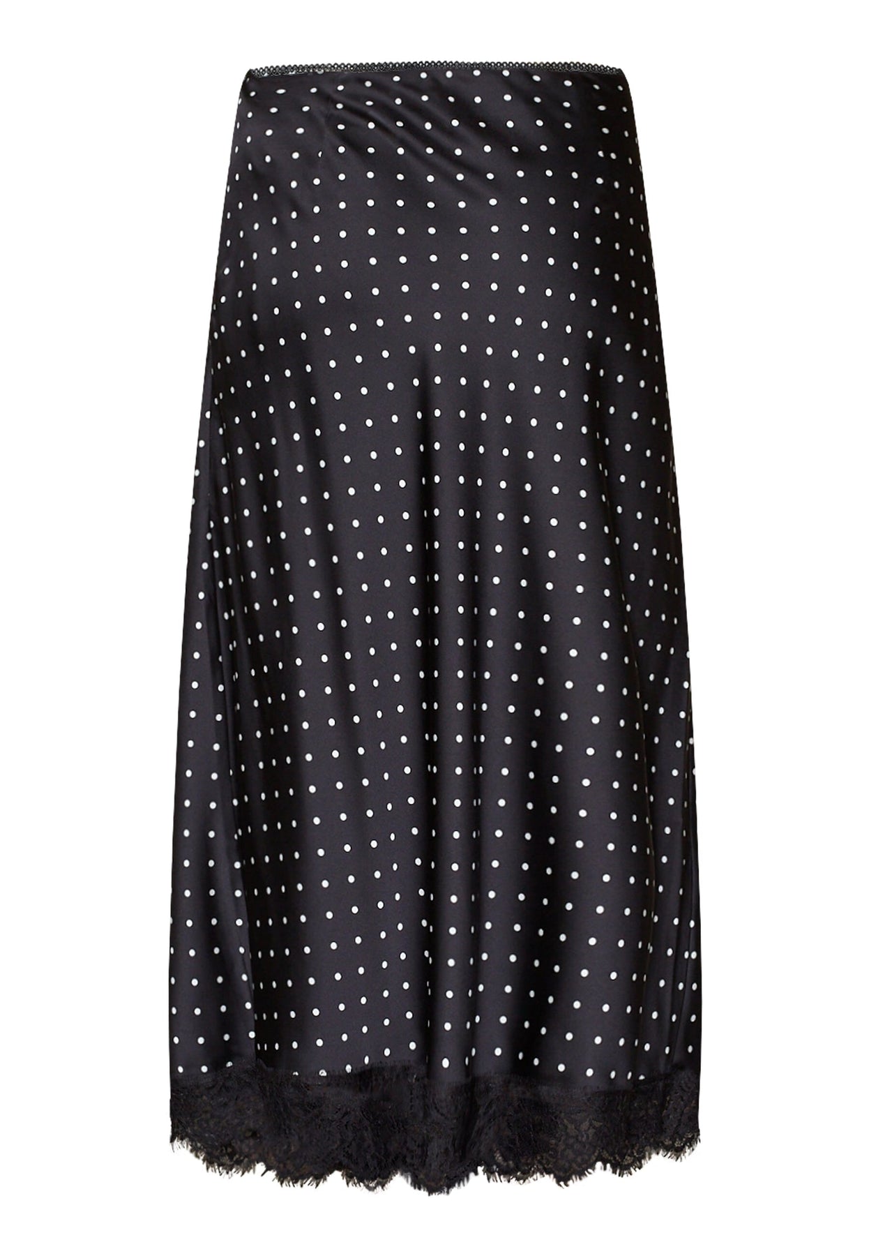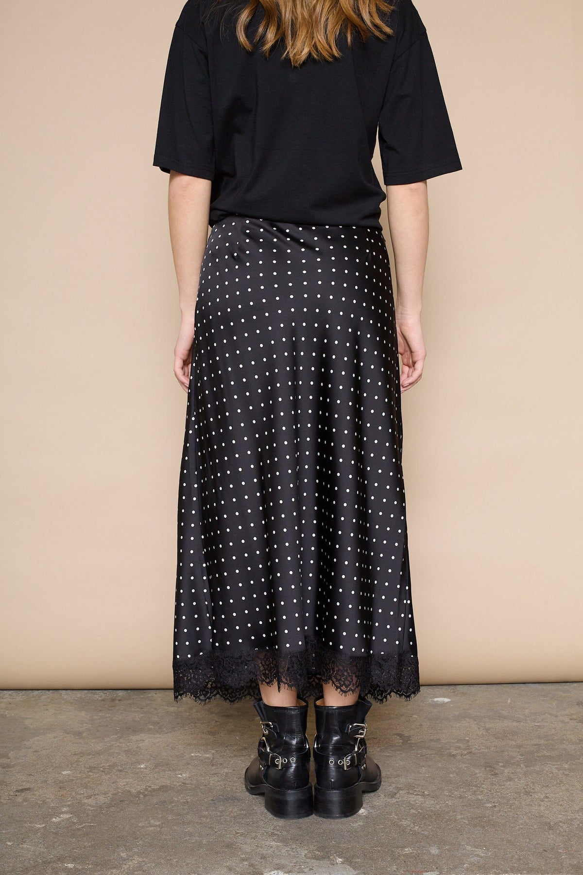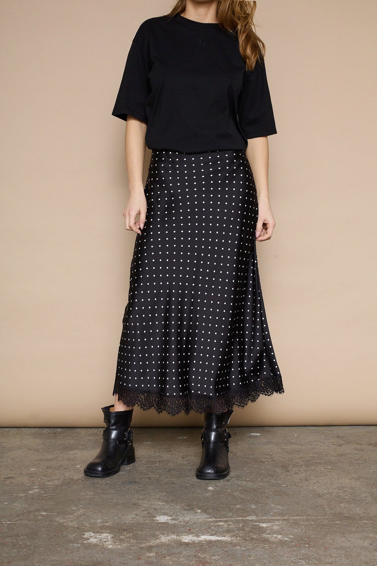 Zwarte rok van Love & Divine met witte stippen. De rok heeft een kanten rand aan de onderkant en valt tot halverwege de kuit.