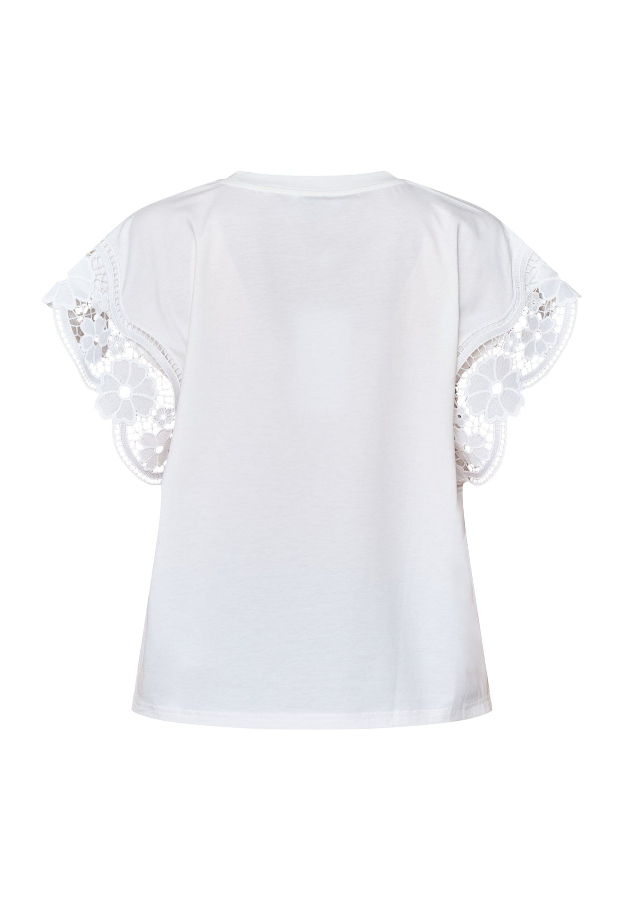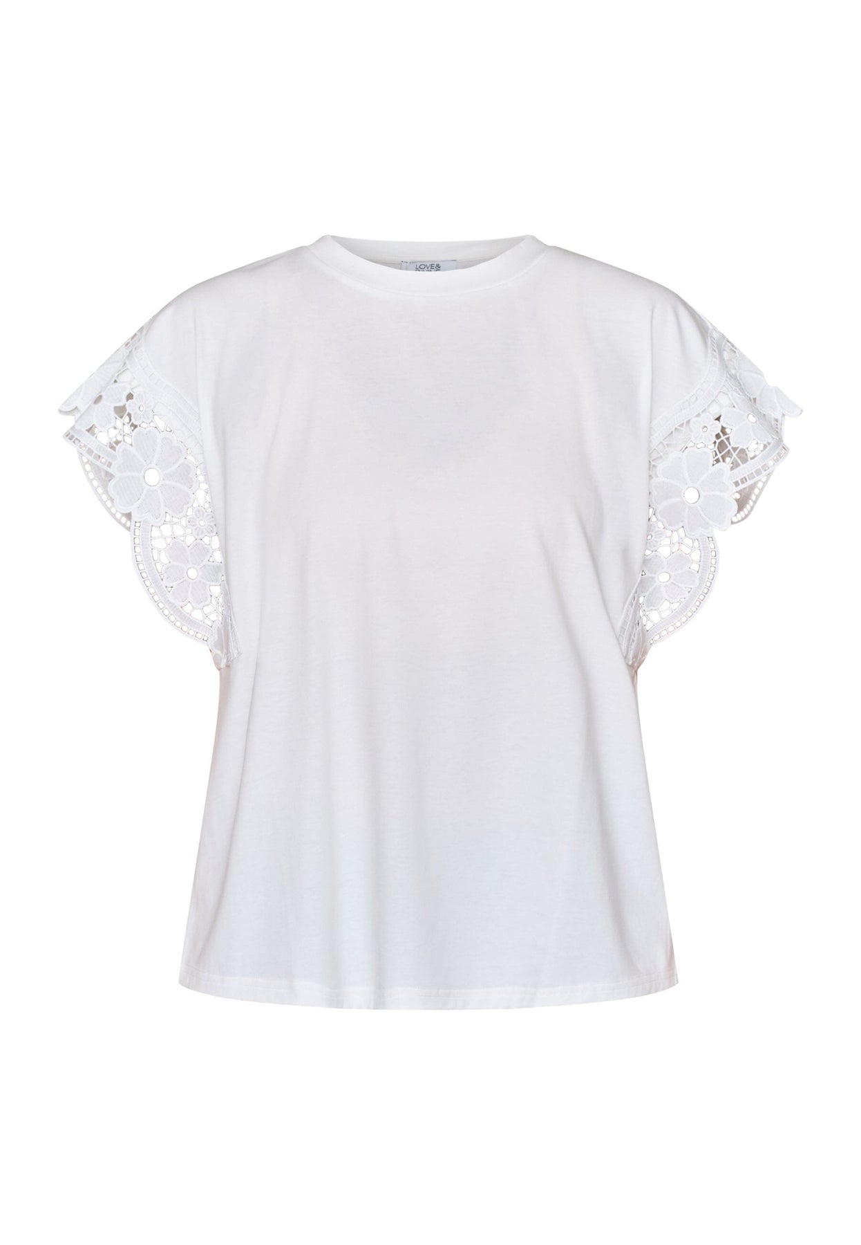 Wit T-shirt van Love & Divine met kant aan de mouwen. Het kant heeft bloemendetails in broderie anglaise-stijl en geeft het T-shirt een vrouwelijke uitstraling.