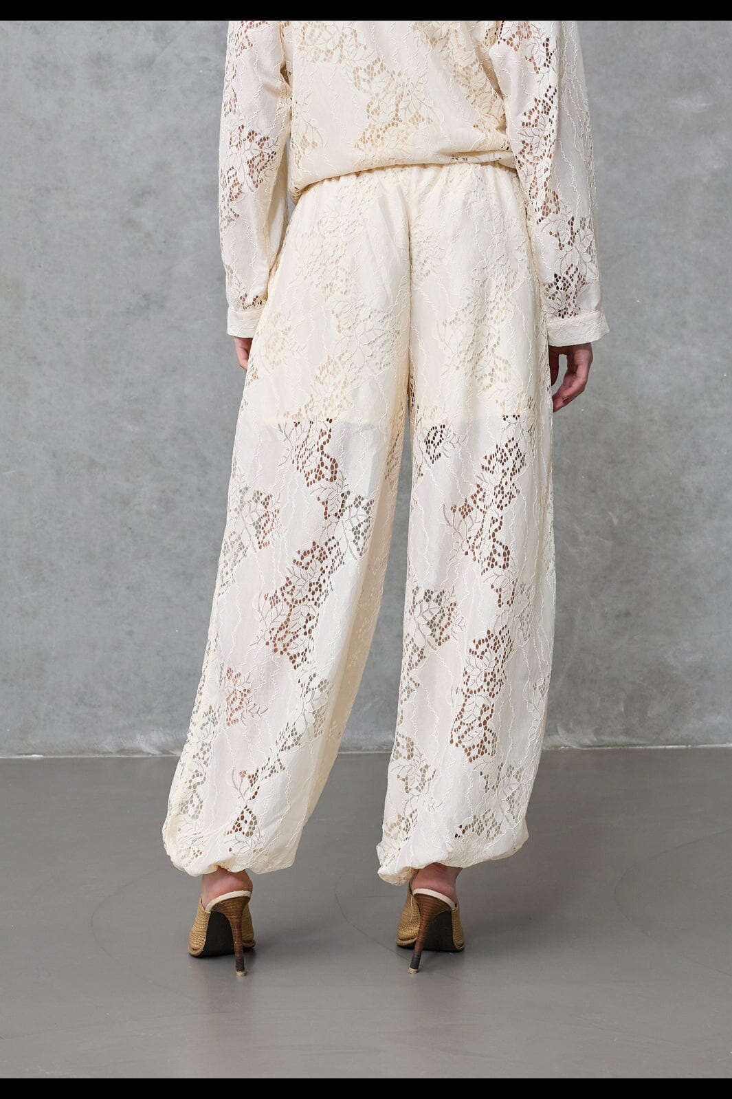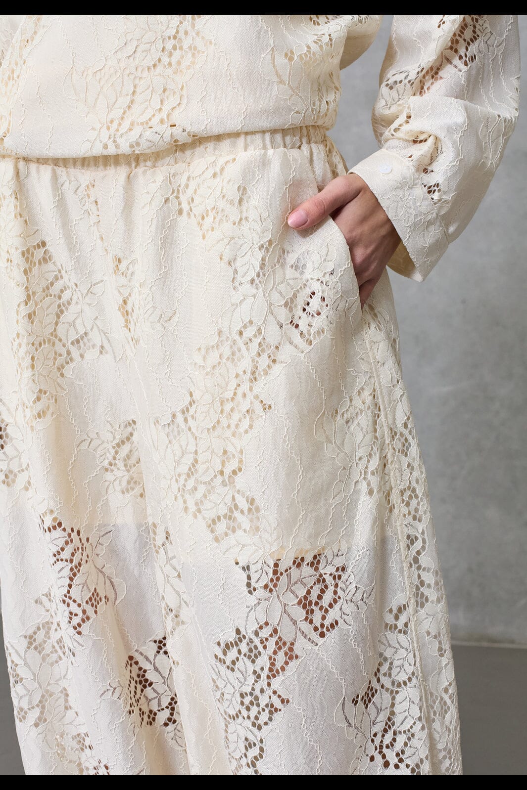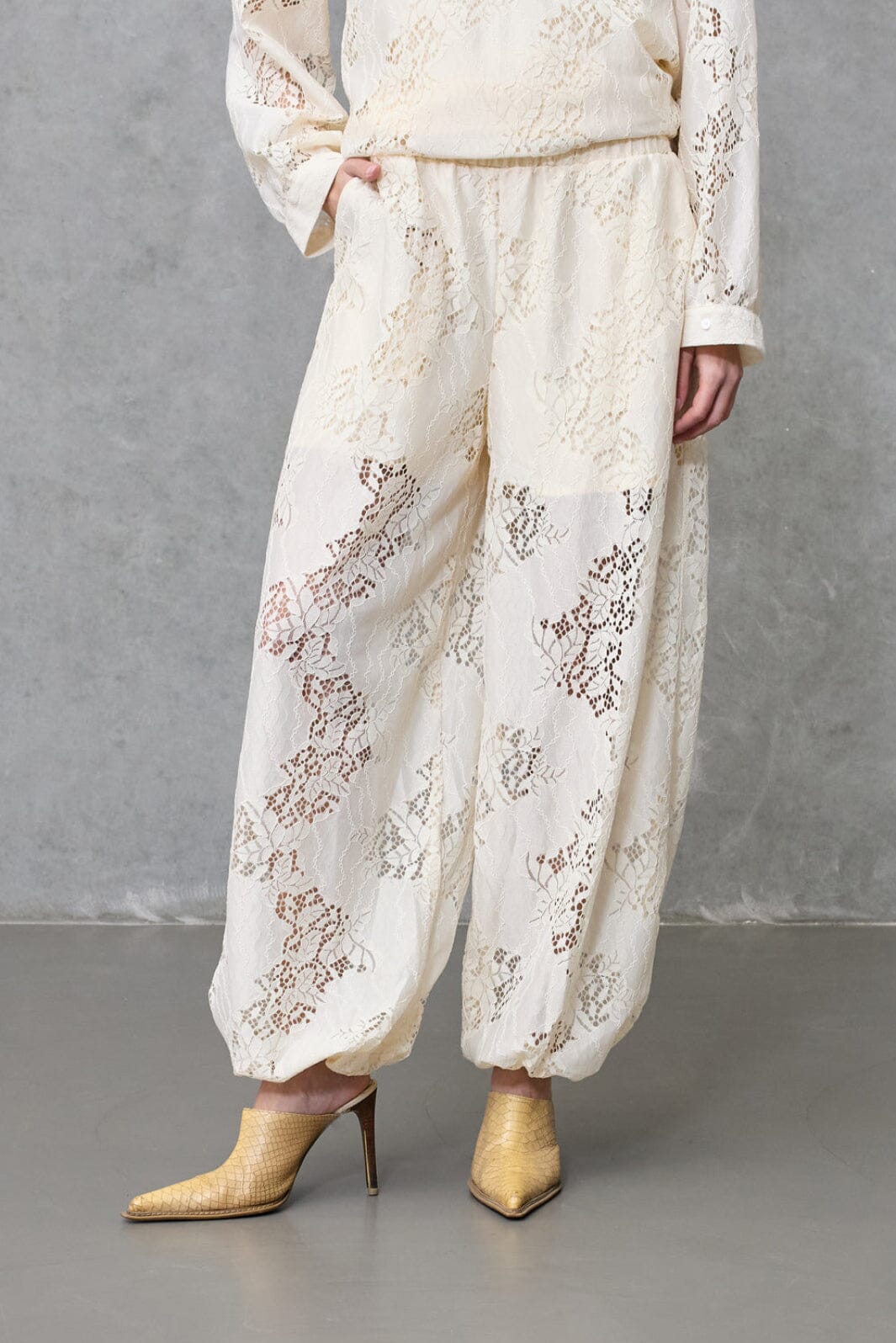 Broek van Love & Divine in crème. Gemaakt van kant met ingenaaide short. De broek heeft een losse pasvorm en een elastische tailleband.