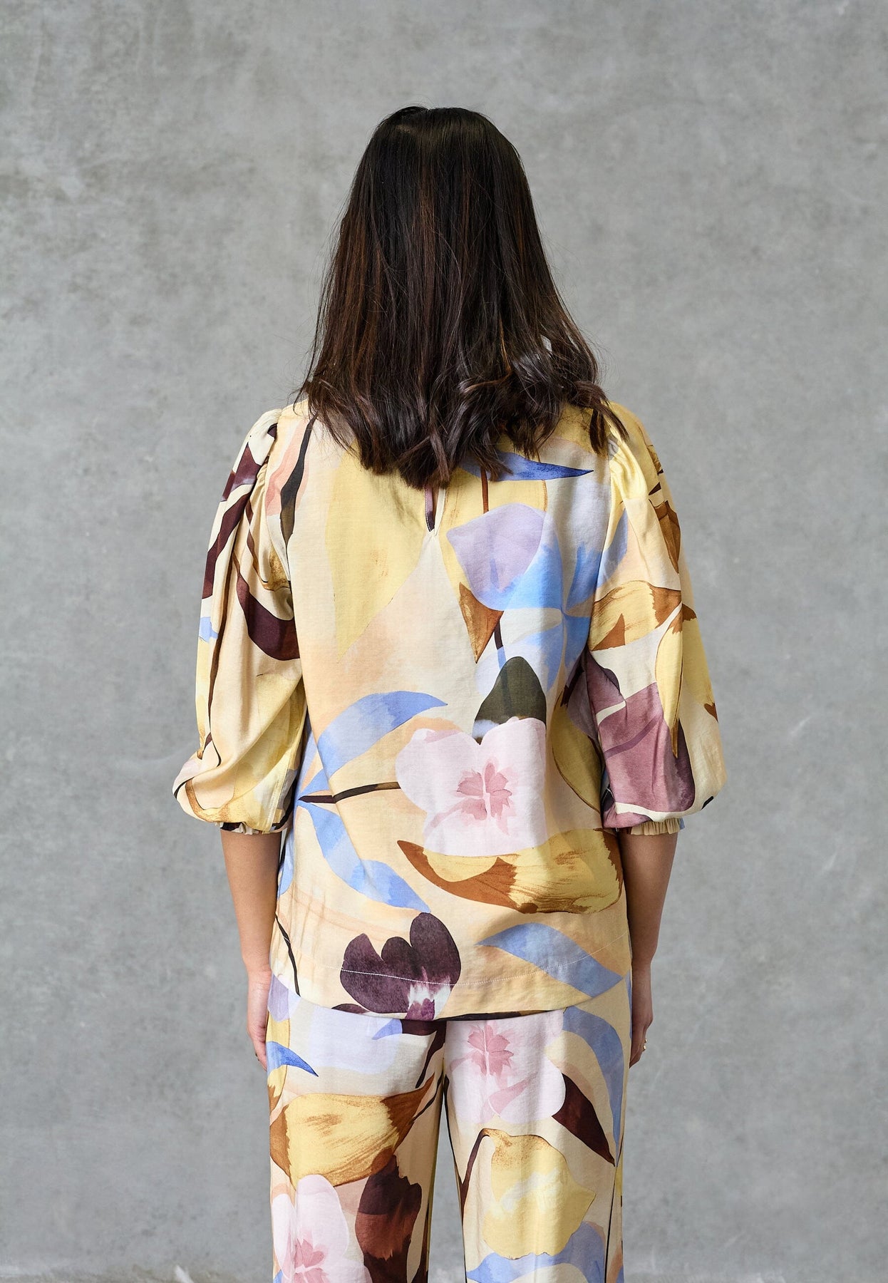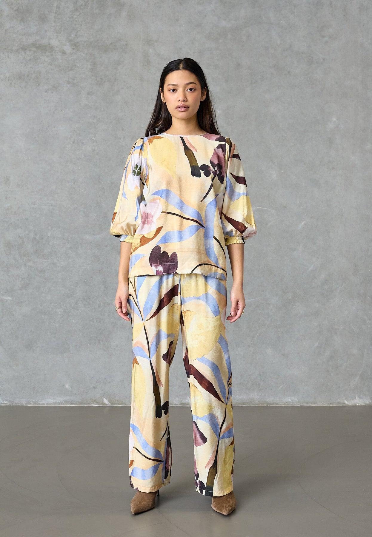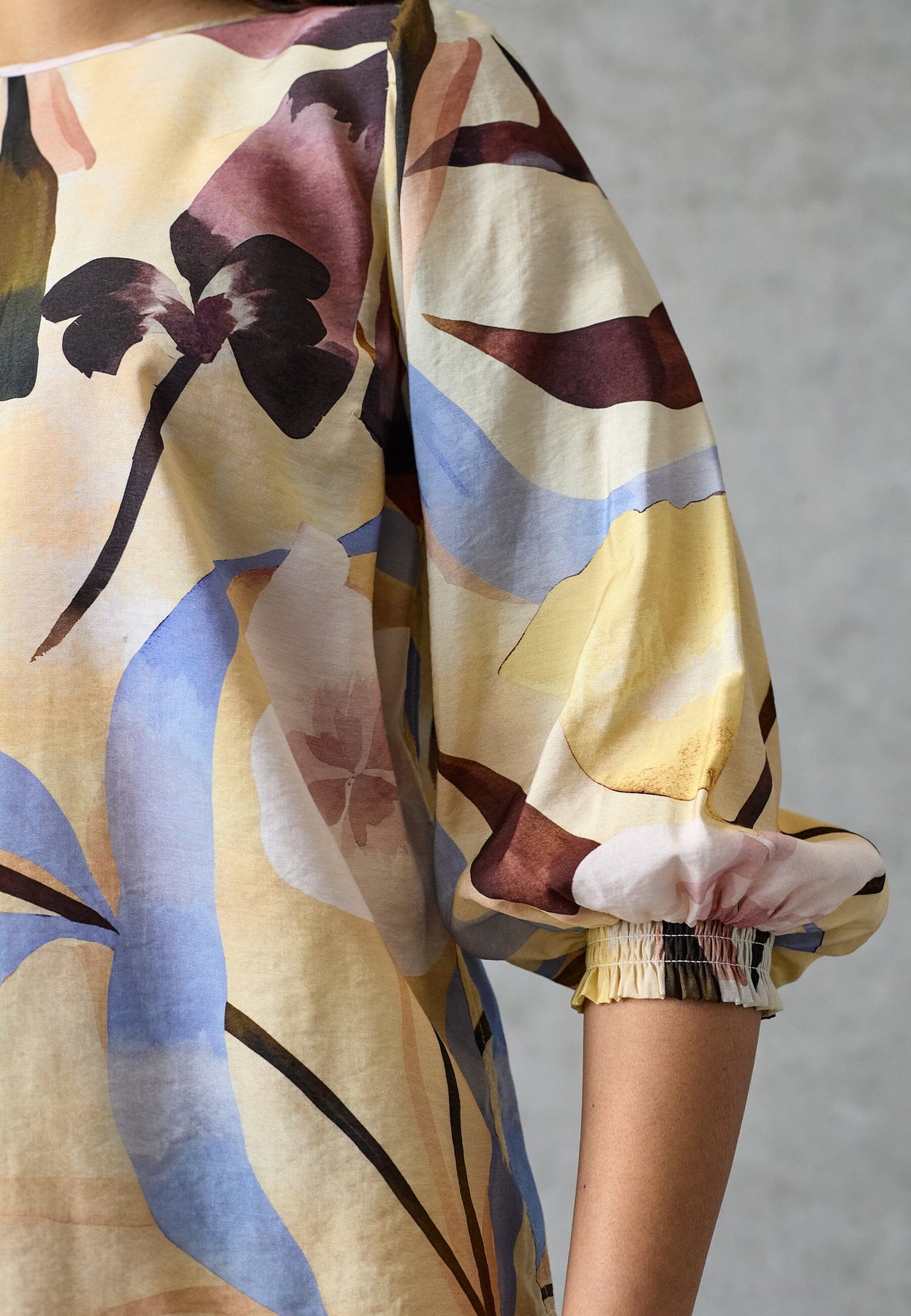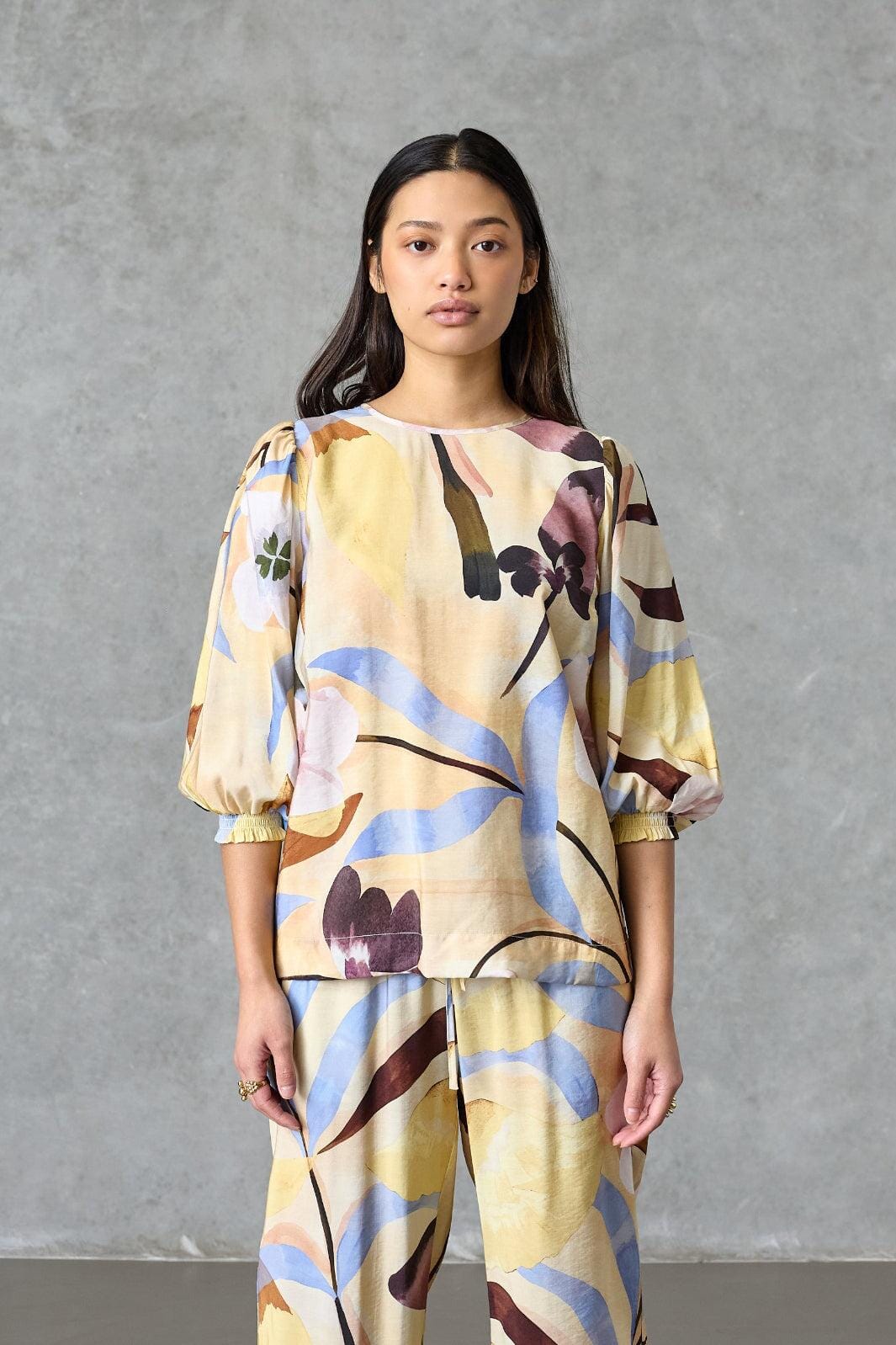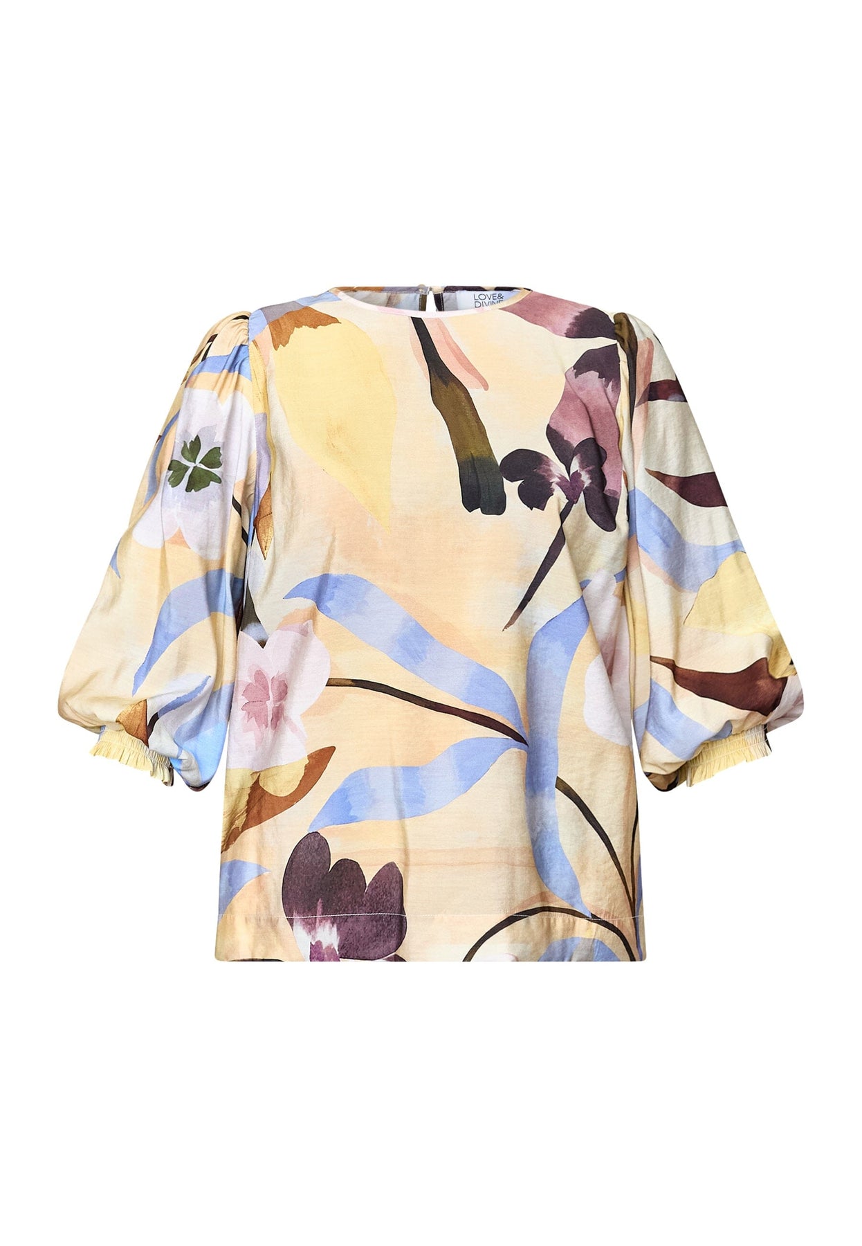 Blouse van Love & Divine in de kleur Antique Flower met een bloemenprint in gele, blauwe, roze en paarse tinten op een lichte achtergrond.