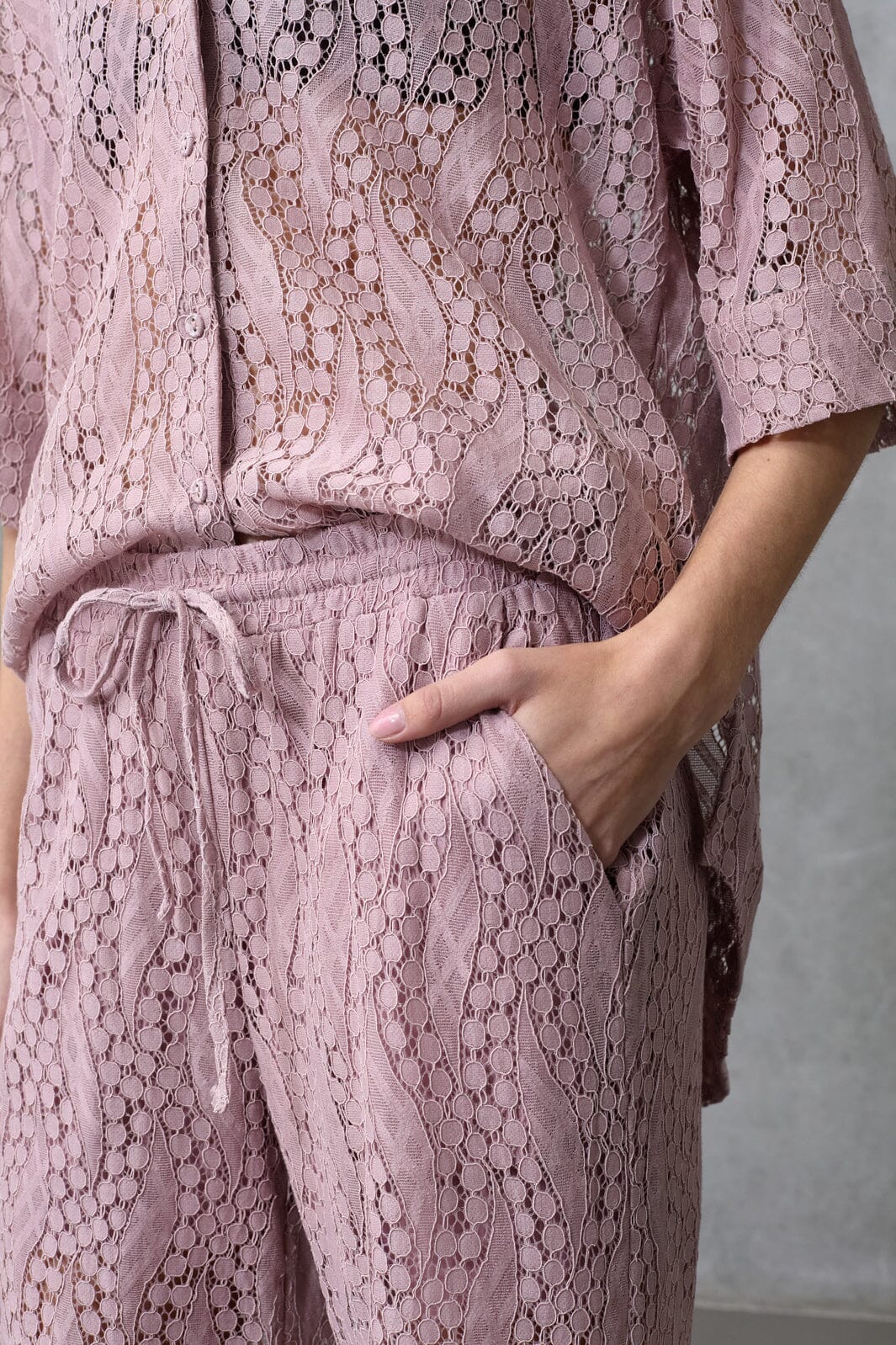 Paarse broek van Love & Divine, gemaakt van kantstof. De broek heeft een losse pasvorm en een elastische taille met trekkoord.