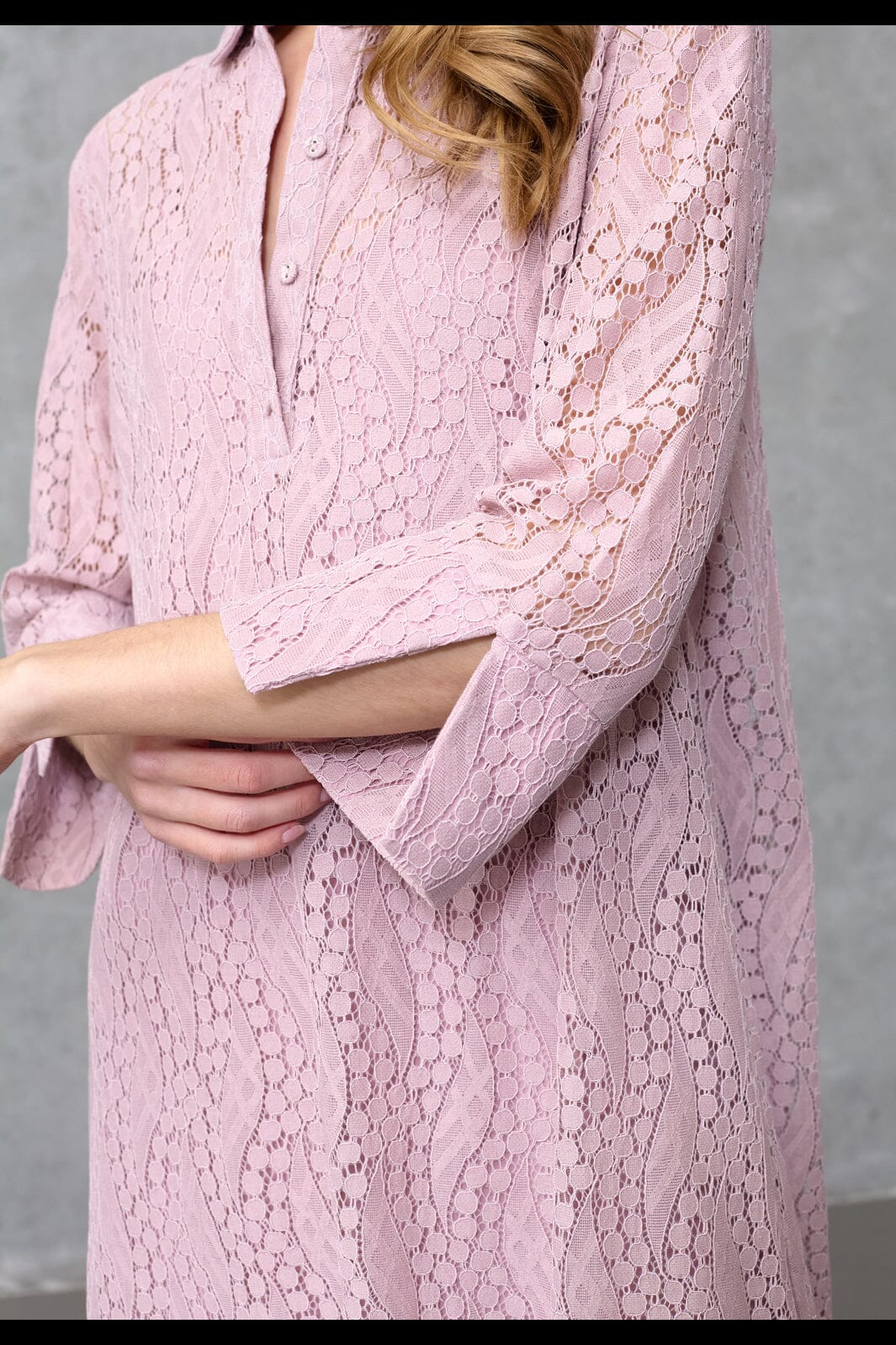 Kanten jurk van Love & Divine in een lila-roze tint. De jurk heeft een overhemdkraag, driekwartmouwen en een losse pasvorm.