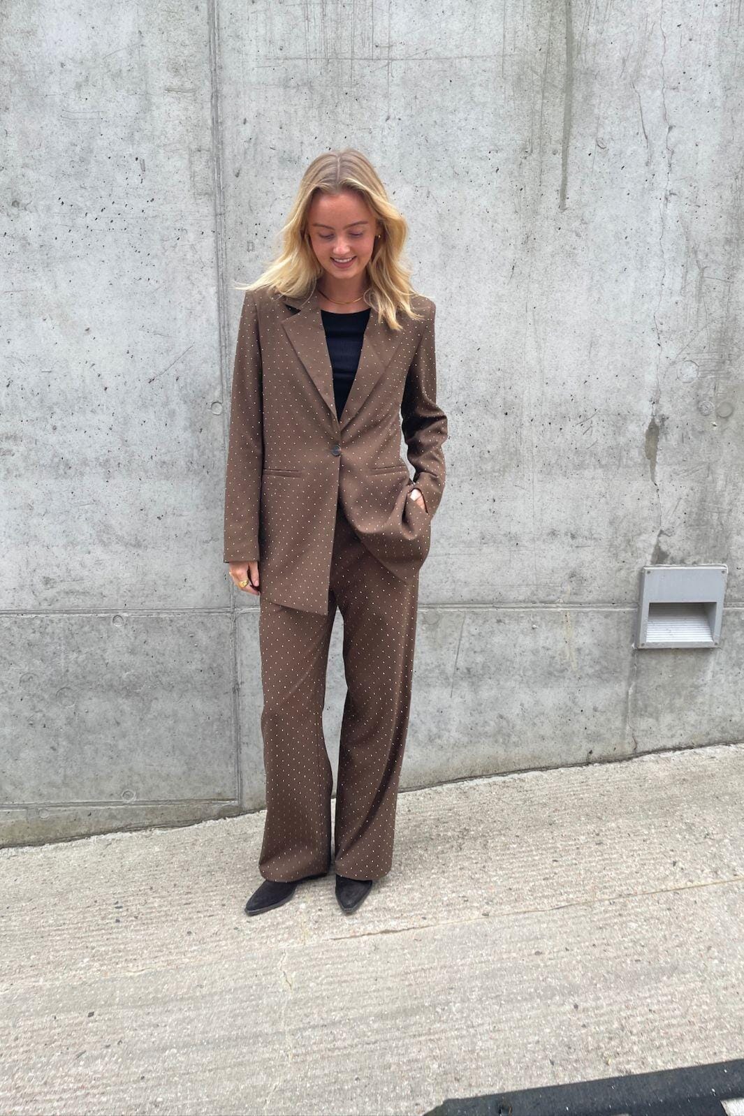 Bruine broek van Love & Divine met kleine strassteentjes over de hele stof. De broek is onderdeel van een pak met een bijpassende blazer.