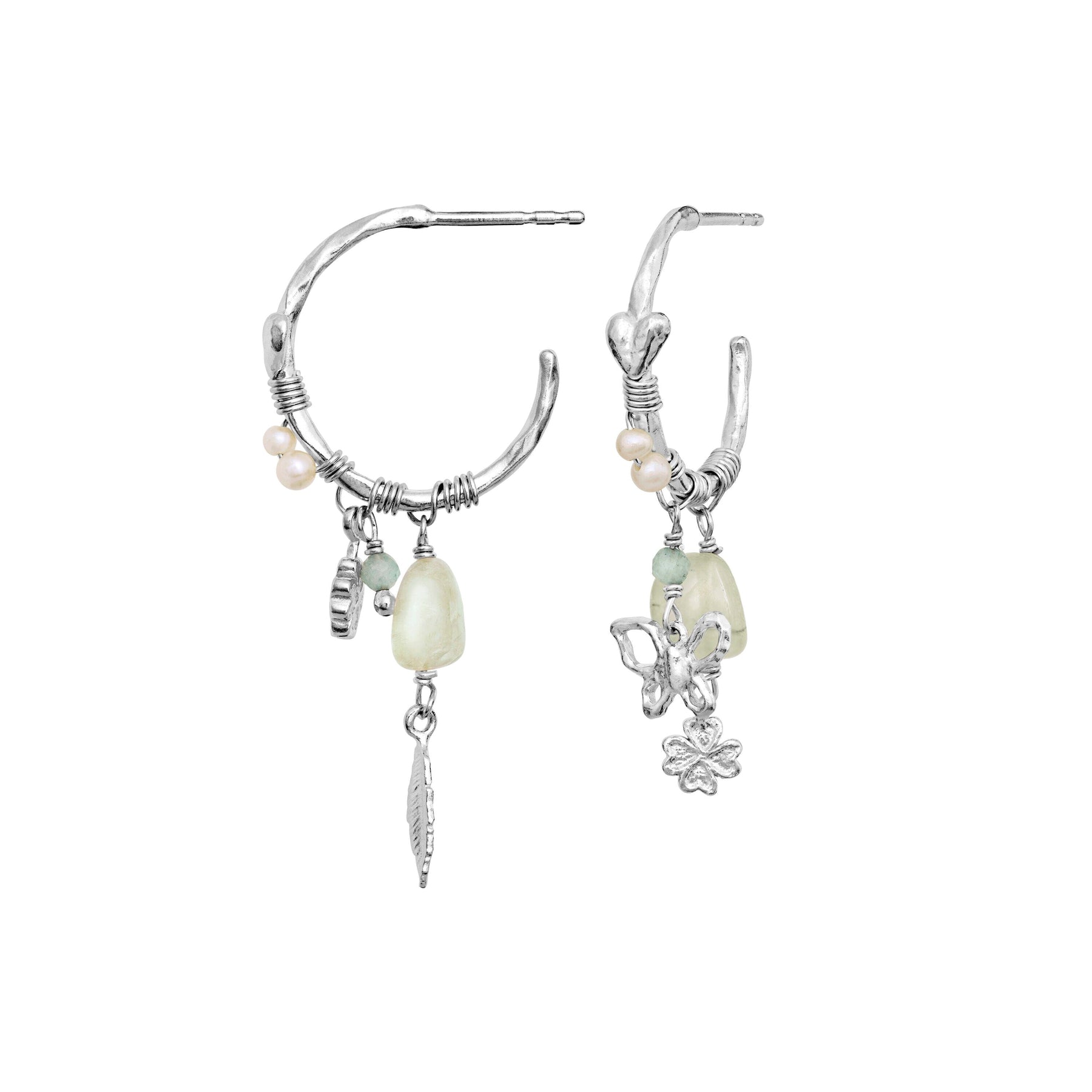 Oorbellen van Maanesten in zilver met een ronde vorm en een onregelmatig, gestructureerd oppervlak. Meerdere hangers omvatten een veer, vlinder, bloem en kleine kralen.