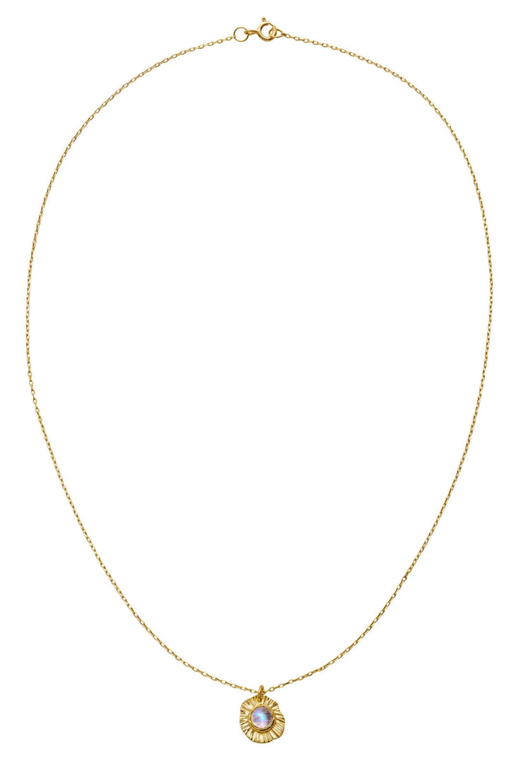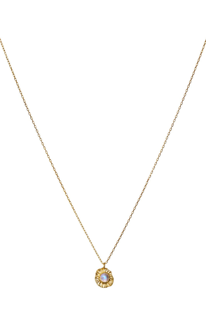 Goudgeplateerde halsketting van Maanesten met een ronde hanger. Het gestructureerde oppervlak heeft een ingelegde steen in het midden, en de ketting meet 45 cm in lengte.