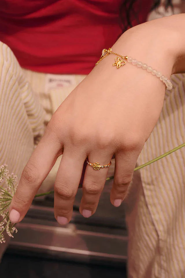 Armband van Maanesten met lichte kralen en een goudkleurige ketting. Het design heeft een kleine vlinder als symbool bij de sluiting.