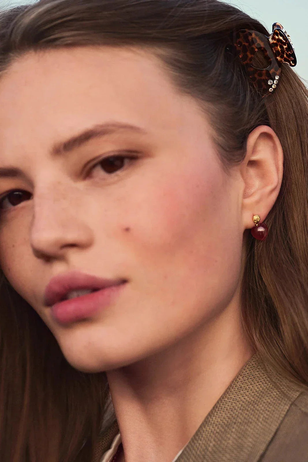 Haarclip van Maanesten met een luipaardpatroon in zwart en bruin. De clip heeft een hartvormige uitsparing en kleine steenachtige details.