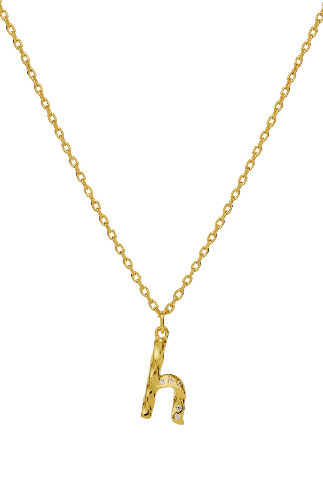 Goudgeplateerde ketting van Maanesten met een h-vormige hanger. De hanger heeft een gestructureerd oppervlak met kleine decoratieve stenen en hangt aan een fijne ketting met schakelontwerp.