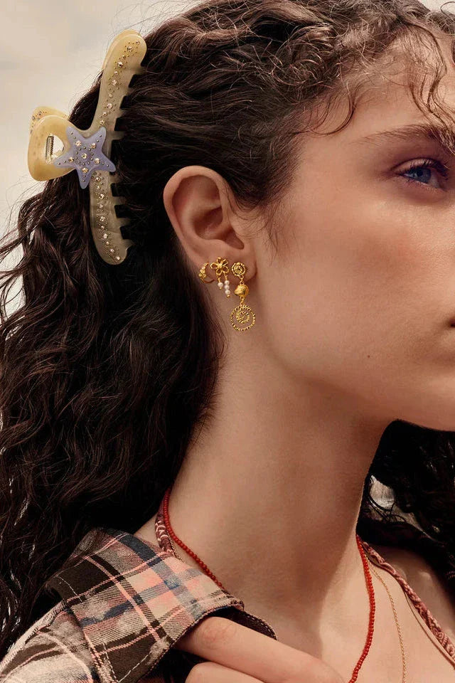 Haarclip van Maanesten in licht beige, geïnspireerd op de onderwatersterren. Deze haarclip is een eerbetoon aan de zeesterren met een blauwe zeesterdecoratie en kleine, glinsterende steentjes.