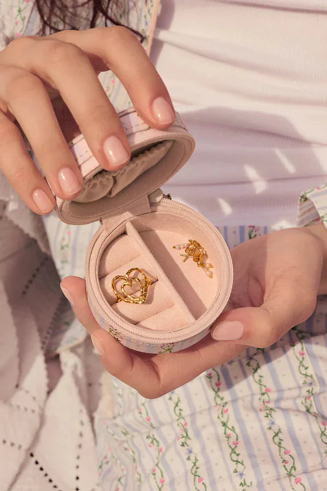 Een ronde sieradendoos van Maanesten van crèmekleurige stof met een tuin-geïnspireerd decoratief patroon van bloemen en fruit in lichtblauwe en witte tinten.