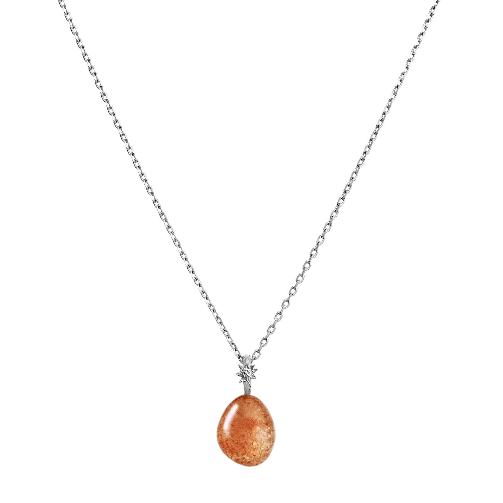 Hanger van Maanesten met een druppelvormige, oranje steen. De hanger heeft bovenaan een klein sterontwerp dat de steen met de ketting verbindt.