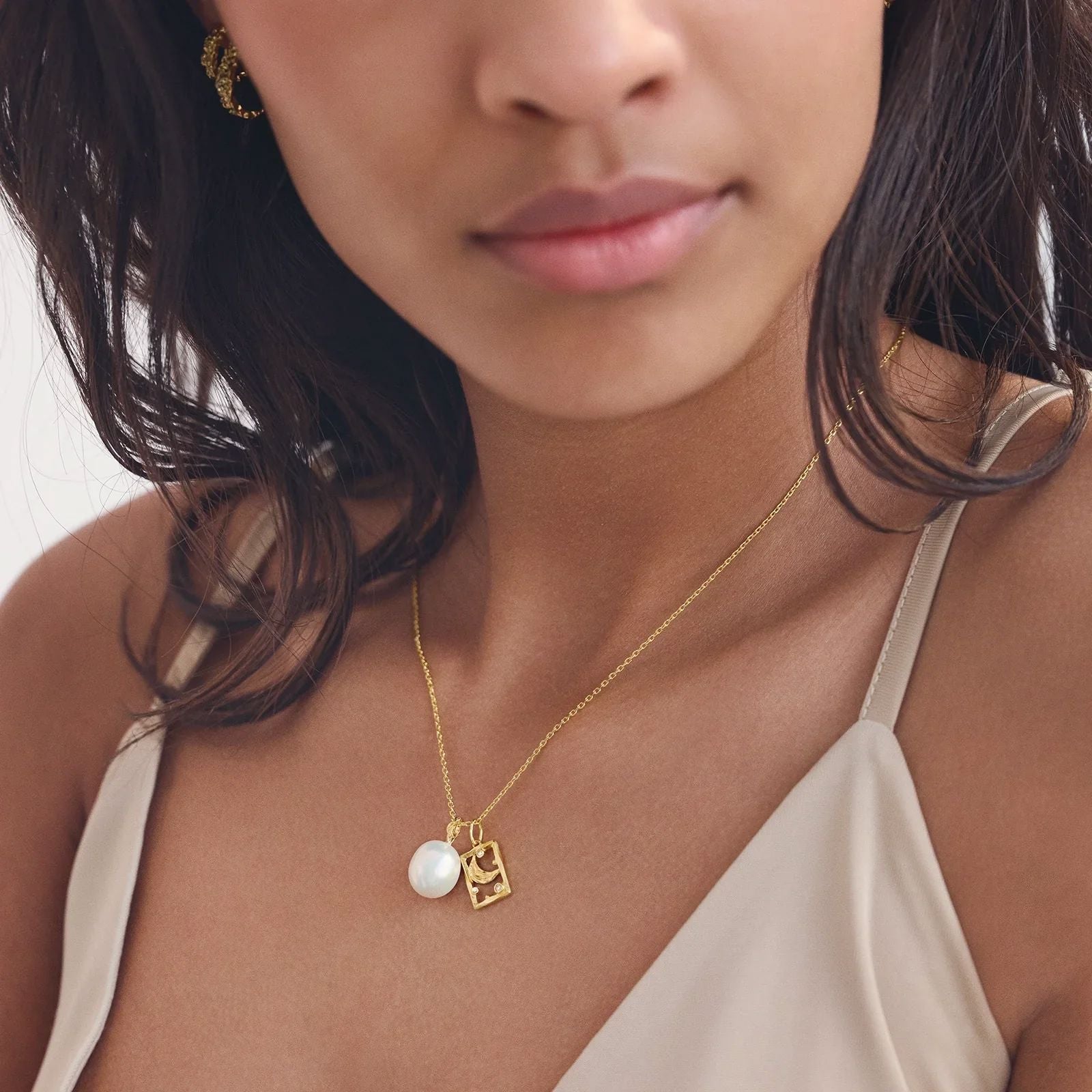 Hanger van Maanesten met een rechthoekig open frame. Het ontwerp bevat een halve maan en kleine cirkelvormige elementen in goud.