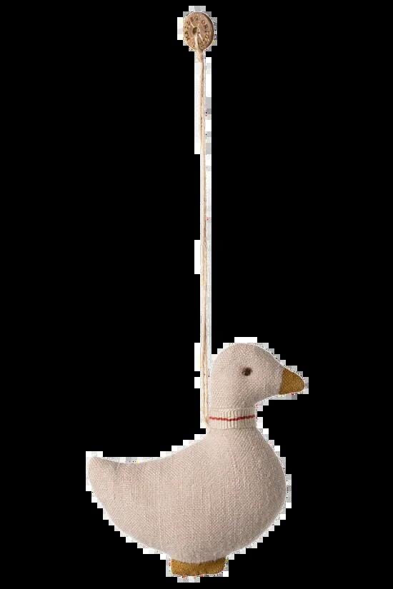 Eendenhanger van Maileg in beige linnen. De eend heeft een zachte vorm met een dun rood lijntje rond de hals en een koord om op te hangen.