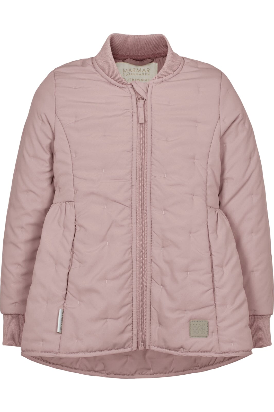 Gequiltede jas van MarMar in roze tint. De jas heeft ribboorden bij de kraag en de mouwen, evenals decoratieve stiksels op de gequiltte buitenstof.