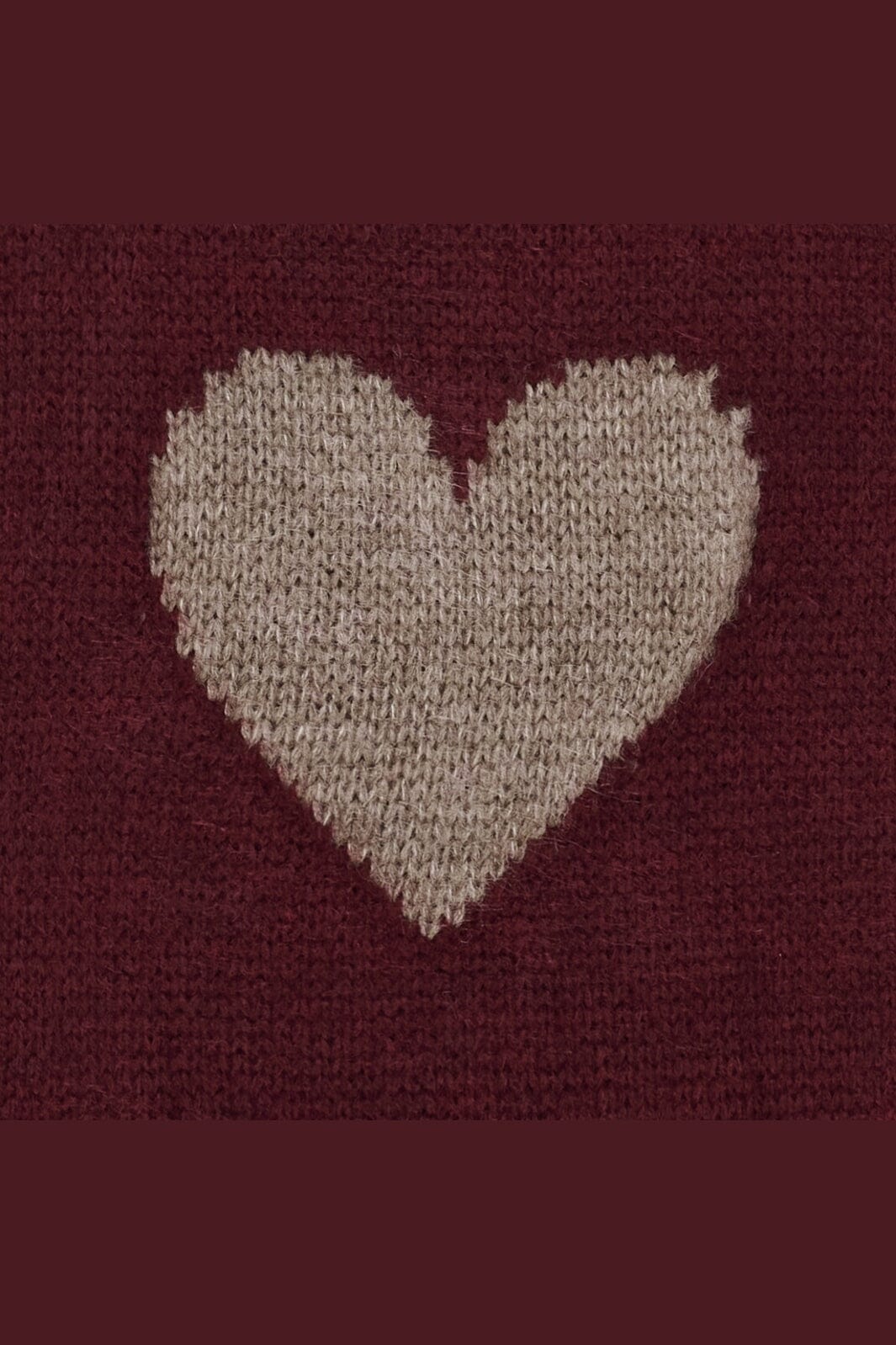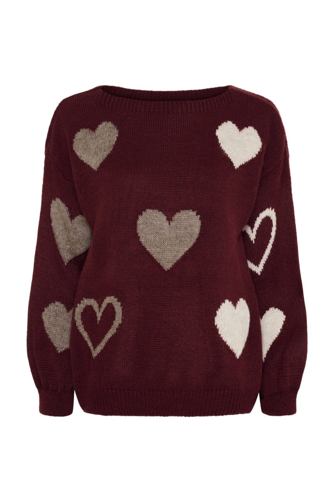 Wijnrode trui van Marta Du Chateau met hartvormige patronen in verschillende tinten. De trui heeft een ronde hals en lange mouwen.