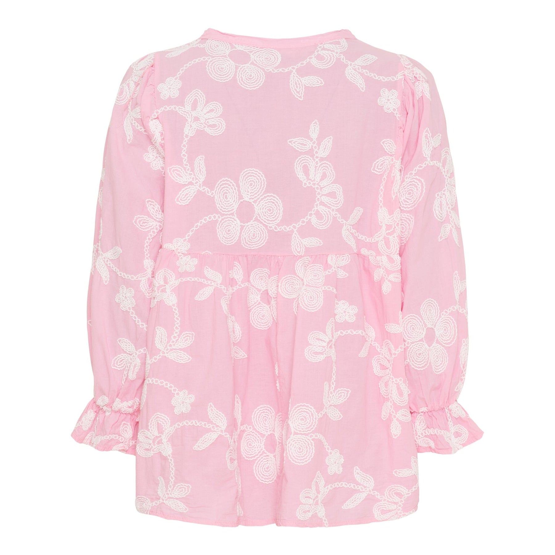Roze blouse van Marta Du Chateau met witte bloemenborduursel. De blouse heeft een losse pasvorm met knoopsluiting aan de voorkant en lange mouwen met gerimpelde manchetten.