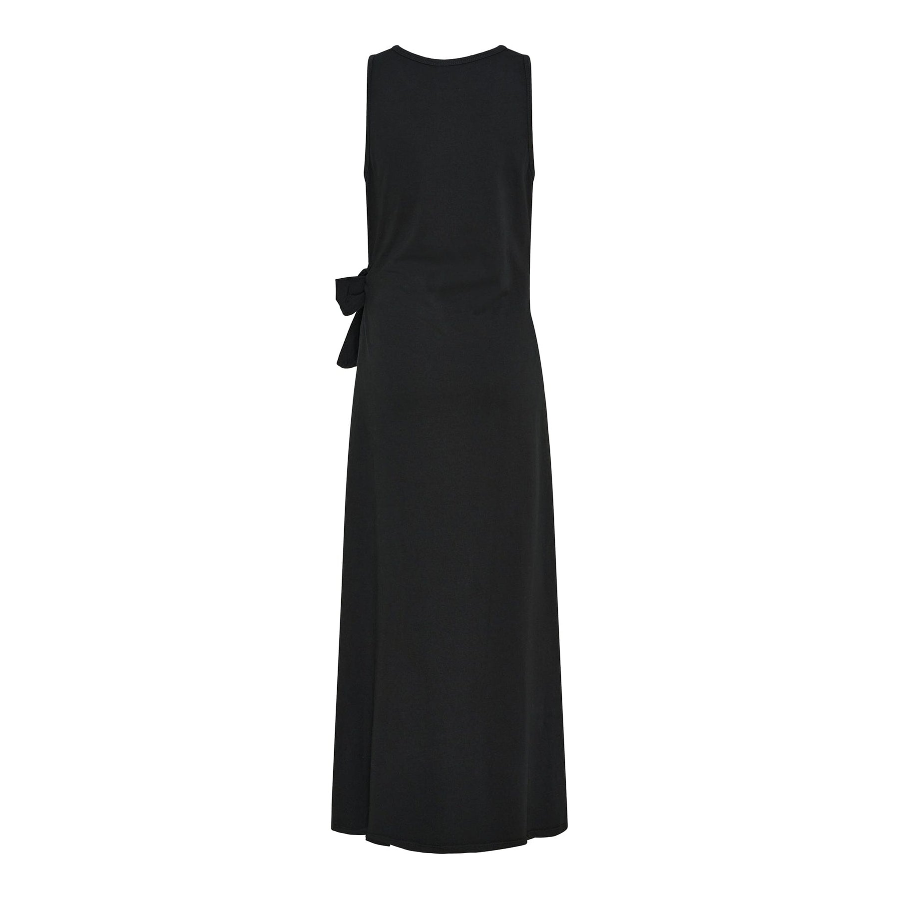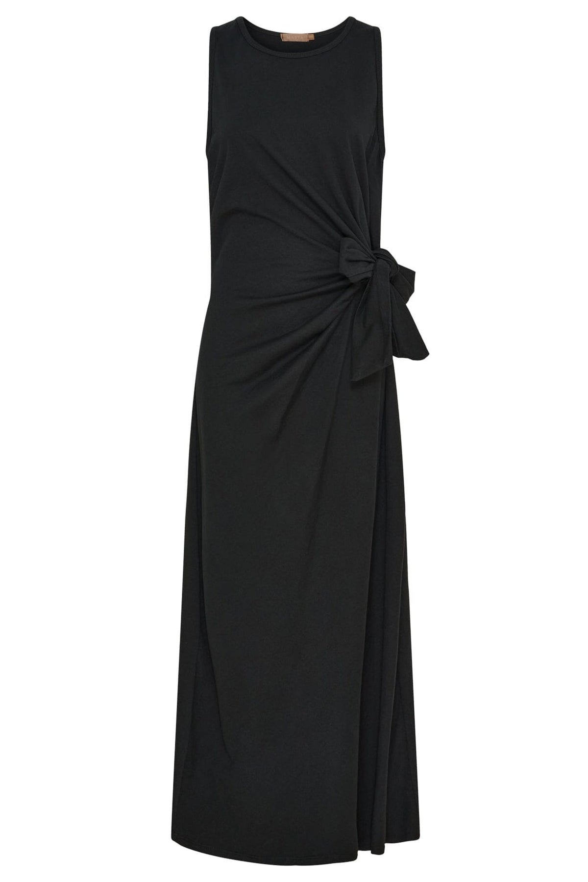 Zwarte, lange jurk van Marta Du Chateau met brede bandjes en ronde hals. De jurk heeft een kenmerkend knoopdetail aan de zijkant dat een eenvoudige en strakke uitstraling creëert.