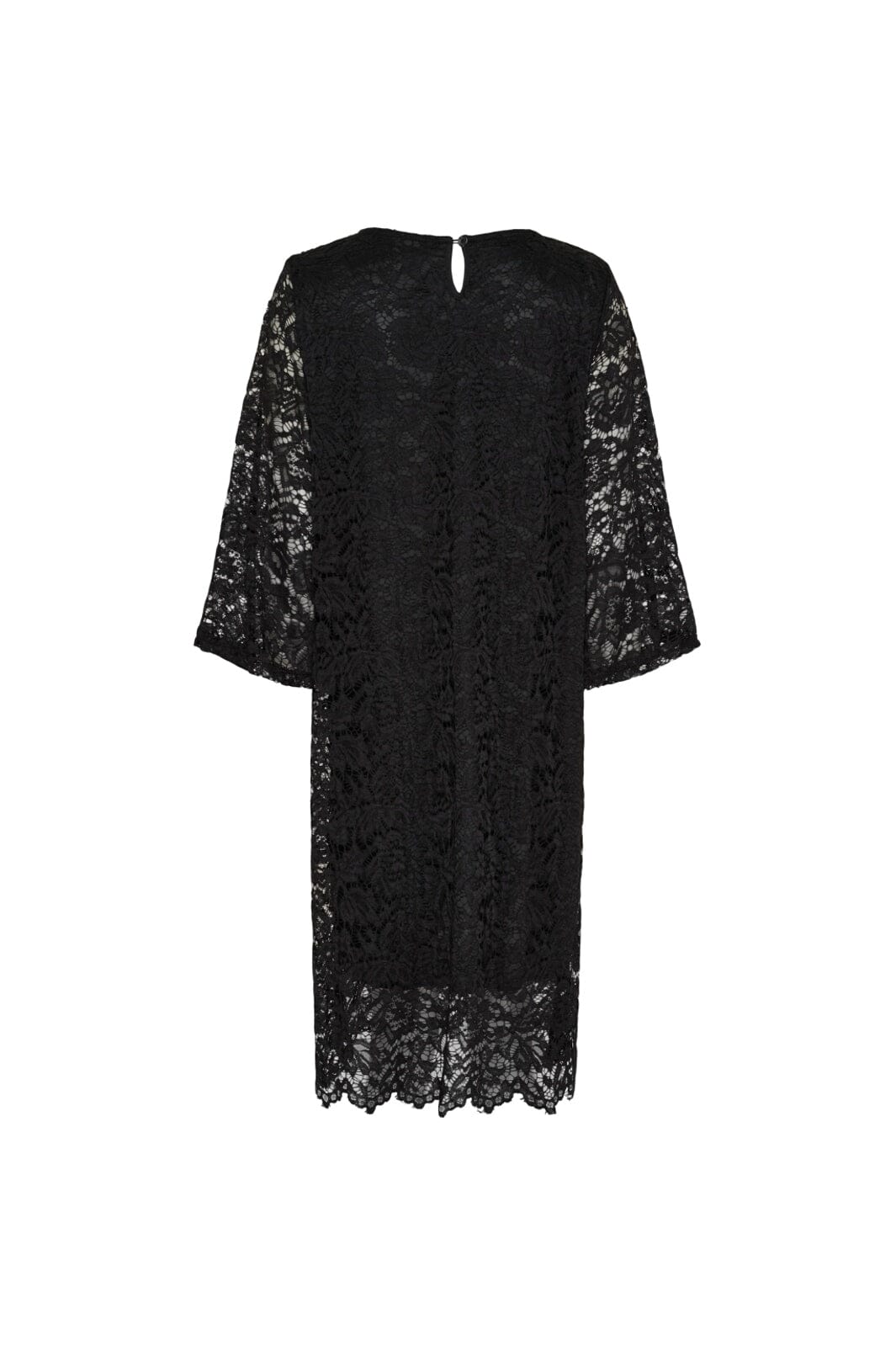 Zwarte kanten jurk van Marta Du Chateau met knielengte. De jurk heeft een losse pasvorm met 3/4-mouwen en een ronde halslijn. Een knoop in de nek maakt het gemakkelijk om aan en uit te trekken.