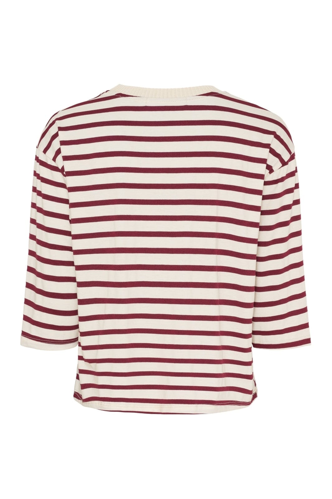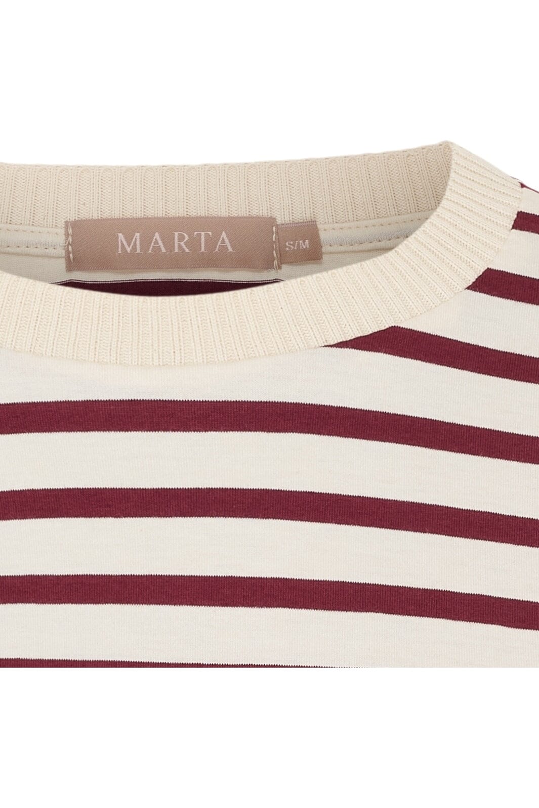 Gestreepte T-shirt van Marta Du Chateau in beige en bordeaux. Het T-shirt heeft een ronde halslijn en 3/4-lange mouwen met horizontale strepen rondom.