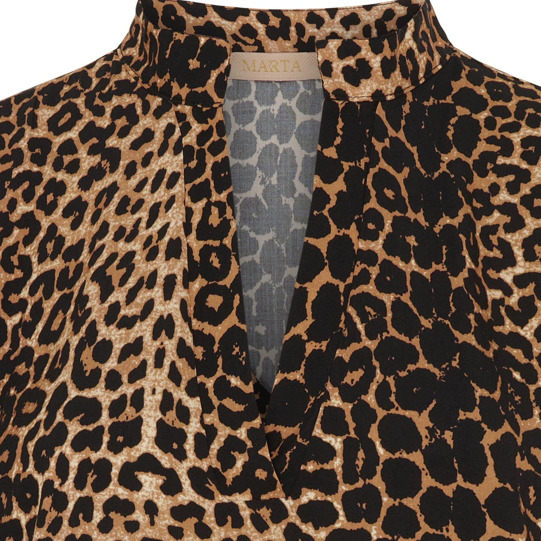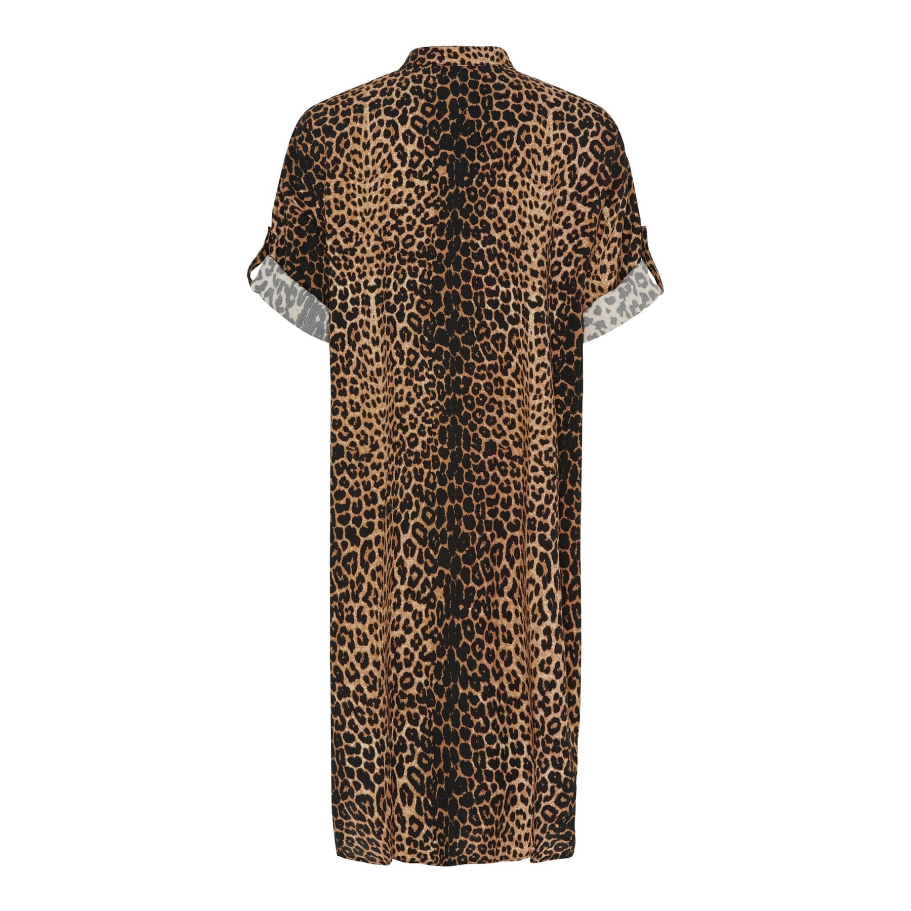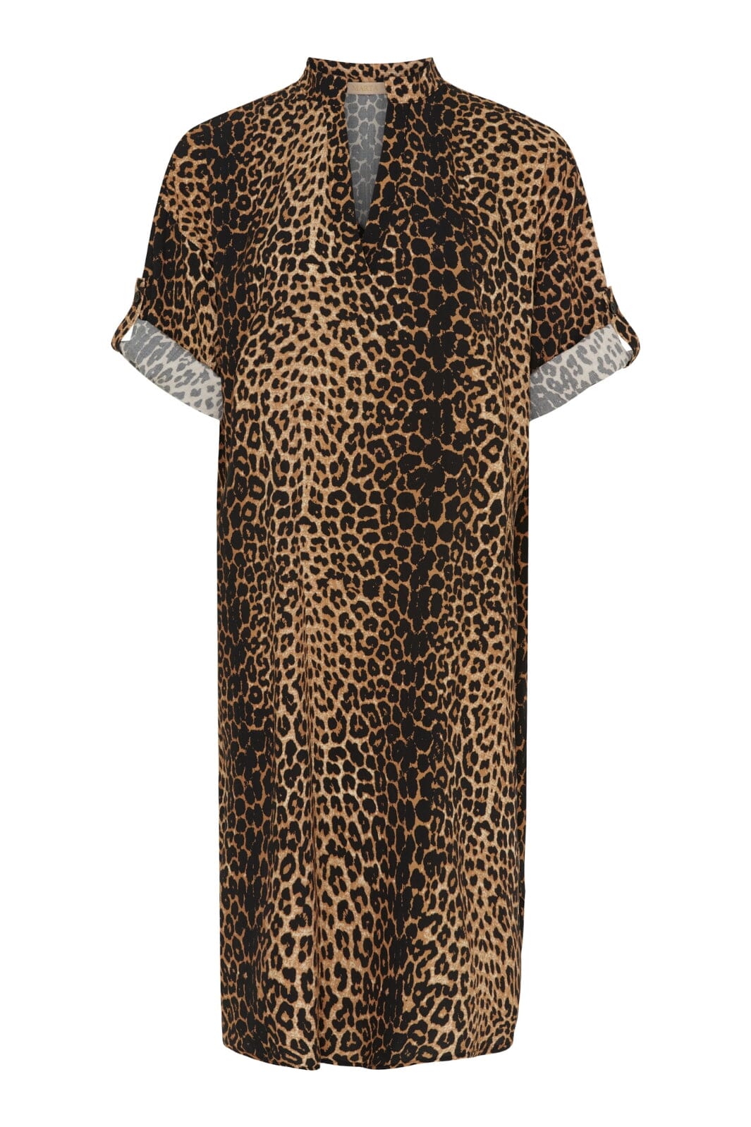 Leopardprint jurk van Marta Du Chateau in bruin en zwart. De jurk heeft korte mouwen met een gerolde rand en komt tot halverwege de kuit.