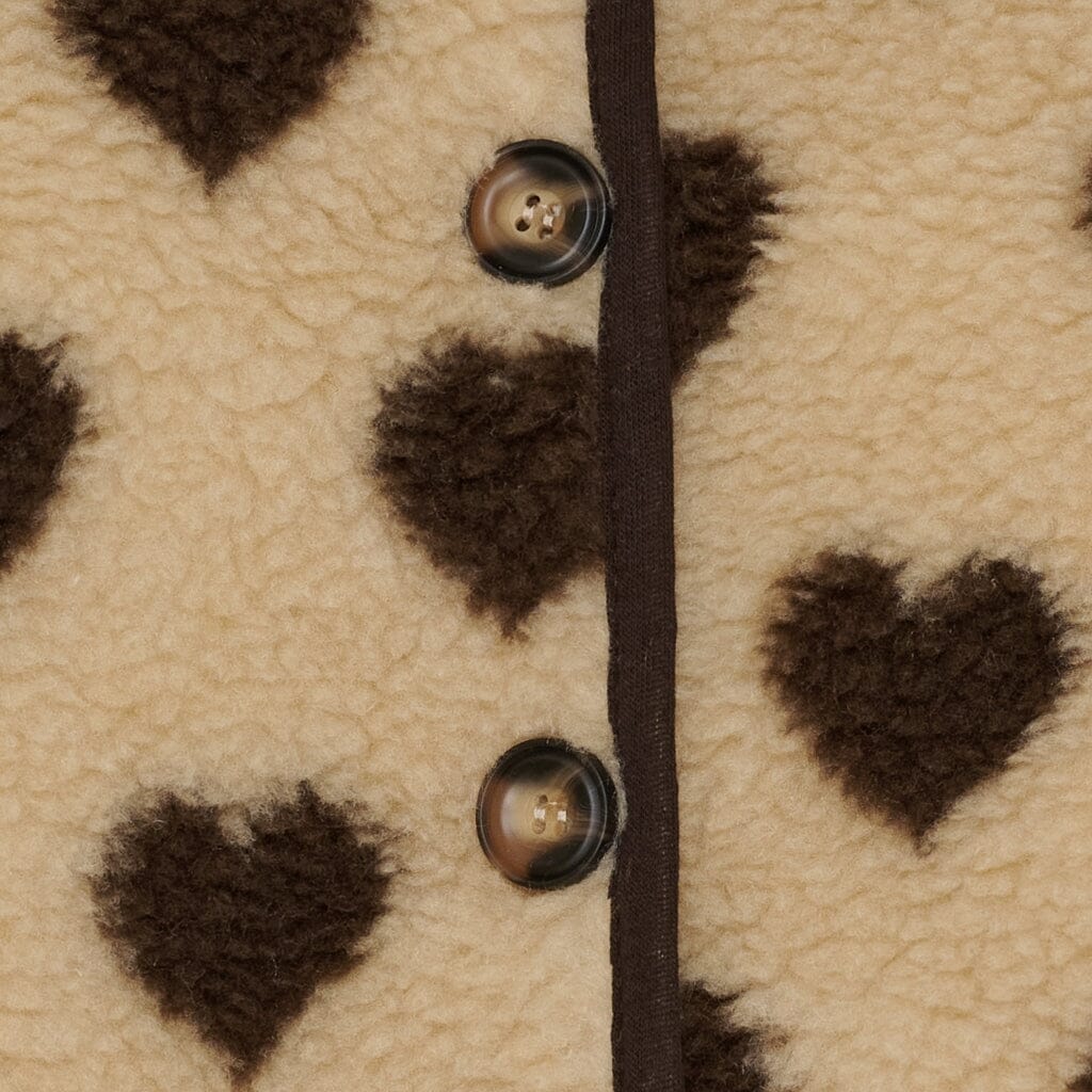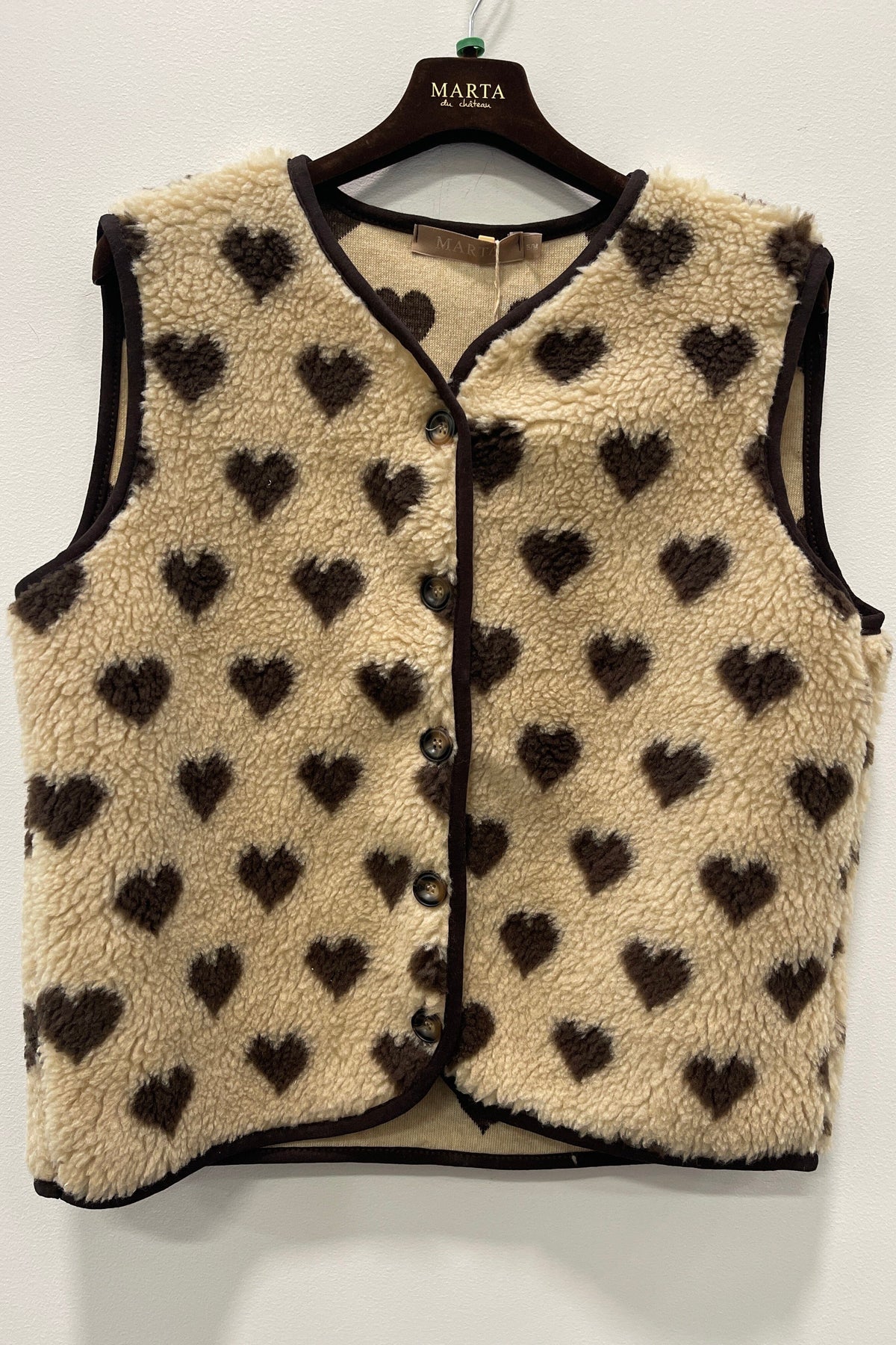Een bodywarmer van Marta Du Chateau met een patroon van donkere harten op een lichtbeige achtergrond. De bodywarmer heeft donkere boorden en een V-hals.