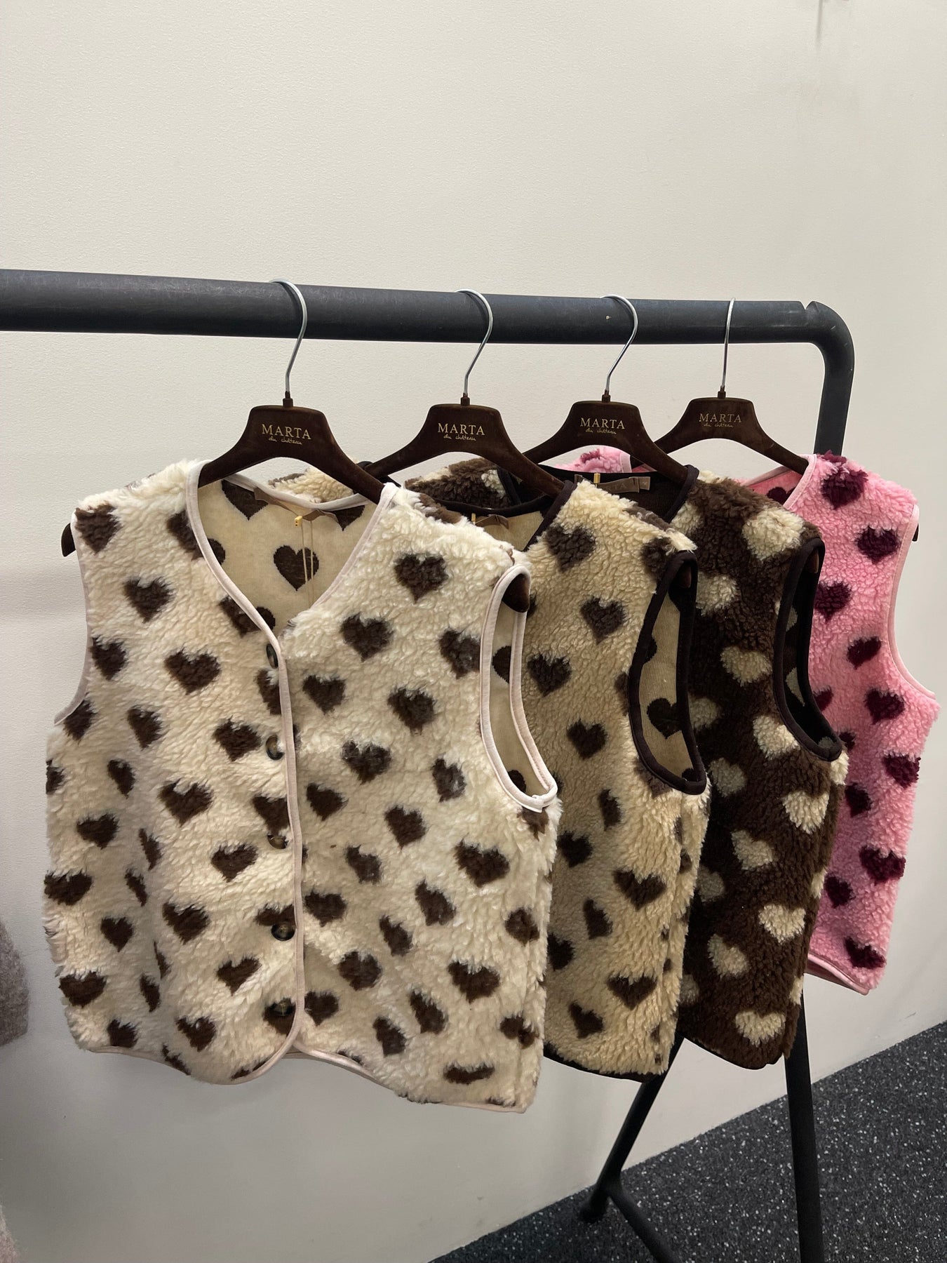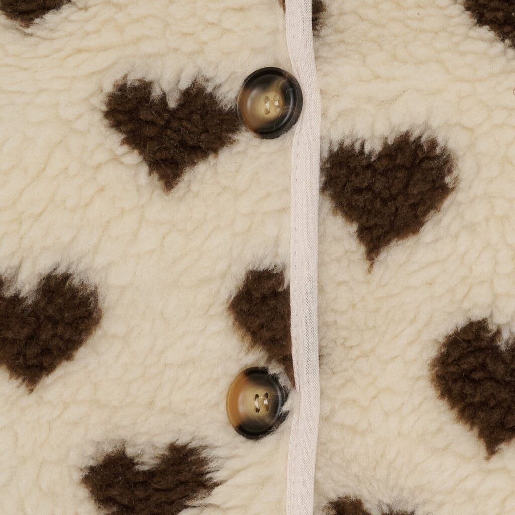 Vest van Marta Du Chateau in crème met donkerbruine hartvormige patronen. De vest heeft donkere randen langs de zijkanten en een knoopsluiting aan de voorkant.