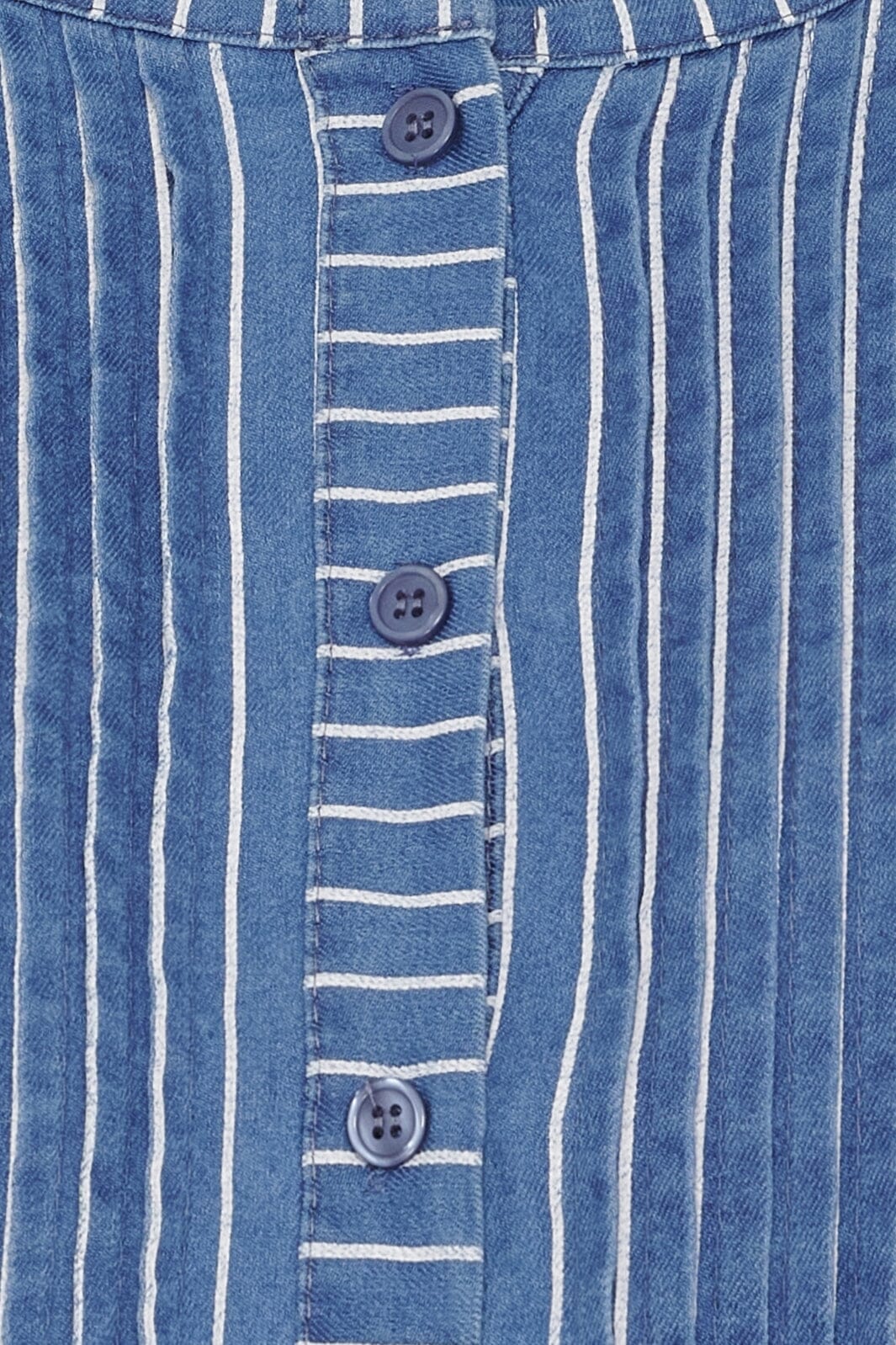 Tussenblauwe blouse van Marta Du Chateau met witte strepen. De blouse heeft knopen aan de voorkant en ruchesdetails die een vrouwelijke uitstraling geven. Ronde hals en lange mouwen.